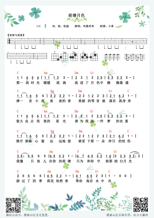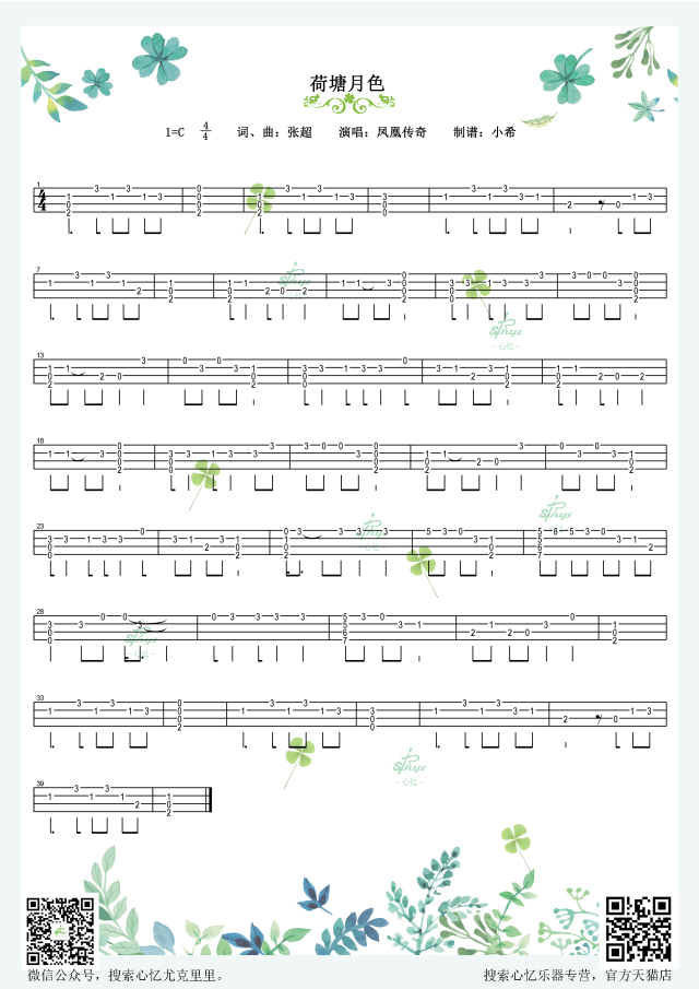 足球买球app推荐-手机APP下载-易唱网echangwang.com 时间:2017-07-09 来源:心忆尤克里里 点击:次 荷塘月色ukulele谱,一首充满的浓浓人文气质的古典中国风歌曲,《荷塘月色》尤克里里谱,小希为大家准备了两个版本,分别是指弹独奏谱和弹唱谱。四线谱图片+和弦图片谱。 荷塘月色尤克里里指弹 凤凰传奇《荷塘月色》ukulele弹唱谱