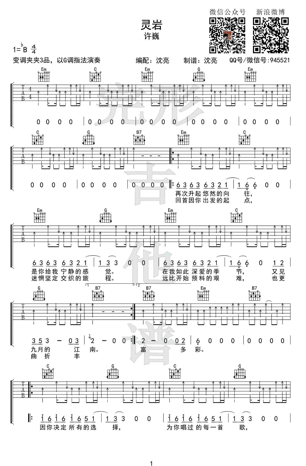 许巍《灵岩》吉他谱 G调扫弦版 弹唱教学示范视频 时间:2017-07-10 来源:完形吉他 点击:次 灵岩吉他谱,许巍《此时此刻》专辑里的一首歌曲,灵岩六线谱,原调降B,变调夹夹三品,以G调指法演奏。前奏和尾奏基本相同的手法,是用两把吉他编配而成,感谢沈亮老师以一把吉他去编配,故以扫弦替代。练练扫弦吧。许巍的歌都挺适合扫弦。据说他本人对扫弦也有很高的要求。