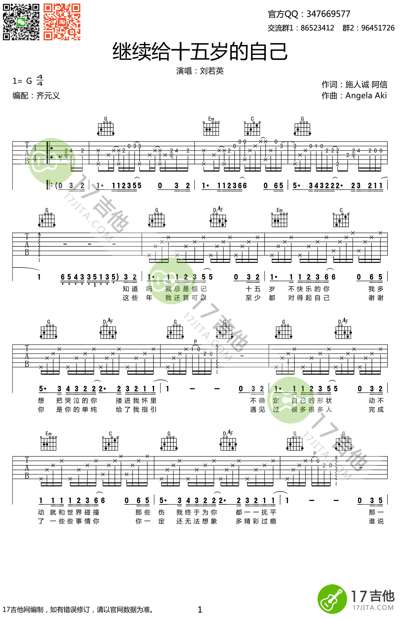 ope官网-手机APP下载-易唱网echangwang.com 时间:2017-07-11 来源:齐元义 点击:次 刘若英《继续-给十五岁的自己》吉他谱,G调指法,高清弹唱谱,完整版四张图片谱例。继续给十五岁的自己六线谱,易唱网上传。歌曲改编自日本歌手Angela Aki《手纸~拝启十五の君へ~》,以书信的口吻向15岁的你娓娓道来,轻柔旋律很有感染力,还未经历15岁的少年会有憧憬与向往,经历过的人听过后会溢出满满的感动。刘若英的翻唱中文版,表现出在时光的打磨下物是人非,但我们要去抓住那些生命中最初也最终的美好的情感。 共2页: 上一页12下一页