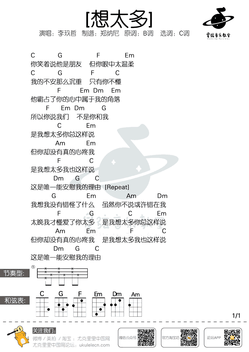 想太多ukulele谱 李玖哲 想太多尤克里里谱 时间:2017-07-12 来源:星弦音乐教室 点击:次 李玖哲《想太多》ukulele谱,原调B选调C,想太多尤克里里谱,星弦音乐教室郑纳尼编配,乌克丽丽和弦表节奏型琴友们参见图片谱标注。想太多乌克丽丽弹唱谱,易唱网推荐曲谱分享。