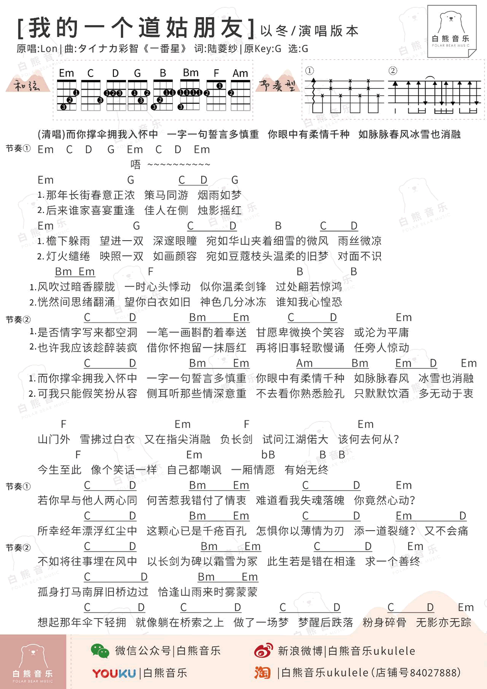 足球外围app排名-手机APP下载-易唱网echangwang.com 时间:2017-07-13 来源:白熊音乐 点击:次 以冬《我的一个道姑朋友》尤克里里谱,G调指法弹唱谱,我的一个道姑朋友ukulele谱,乌克丽丽和弦与节奏型标注在图片谱,琴友们可以参照练习,感谢白熊音乐编配。一首让人惊艳的古风歌曲,易唱网尤克里里曲谱专栏分享。