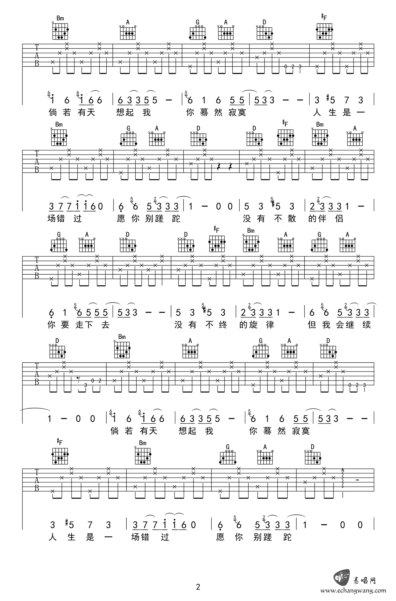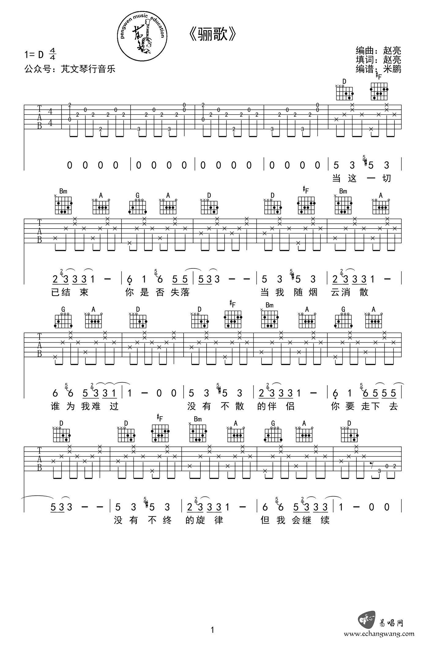 骊歌吉他谱 GALA《骊歌》六线谱 高清弹唱谱 时间:2017-07-14 来源:米鹏 点击:次 GALA《骊歌》吉他谱,D调指法,高清弹唱谱,两张图片谱子。骊歌六线谱,感谢芃文琴行出品,易唱网上传推荐。很喜欢这首歌,道出了人生的真谛,生活有无数次相逢与再见,总是难以摆脱那种淡淡的忧郁。如歌中所唱:”倘若有天想起我 你蓦然寂寞,人生是一场错过 愿你别蹉跎“故事都很美,却总都有个结尾,别伤感,还会再见。