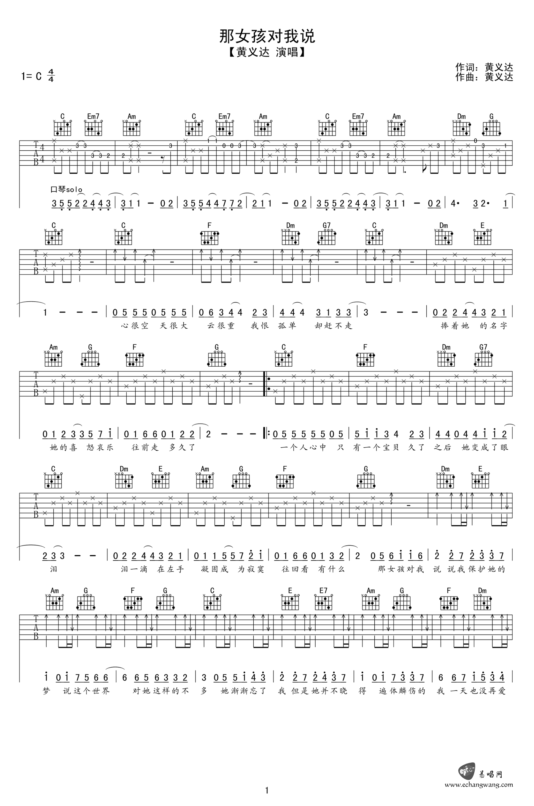 qy88千赢国际网页手机登录-手机APP下载-易唱网echangwang.com 时间:2017-07-15 来源:网络 点击:次 黄义达《那女孩告诉我》吉他谱,C调弹唱谱,那女孩对我说六线谱,高清图片谱。新加坡歌手、音乐才子黄义达的一首经典歌曲,爱上一首歌一个人可能不是因为旋律多动听,嗓音多感人,而是因为,你恰好也有个故事,又恰好在什么都不懂的年纪,借以歌曲慰藉,得到的感触能深埋一辈子。