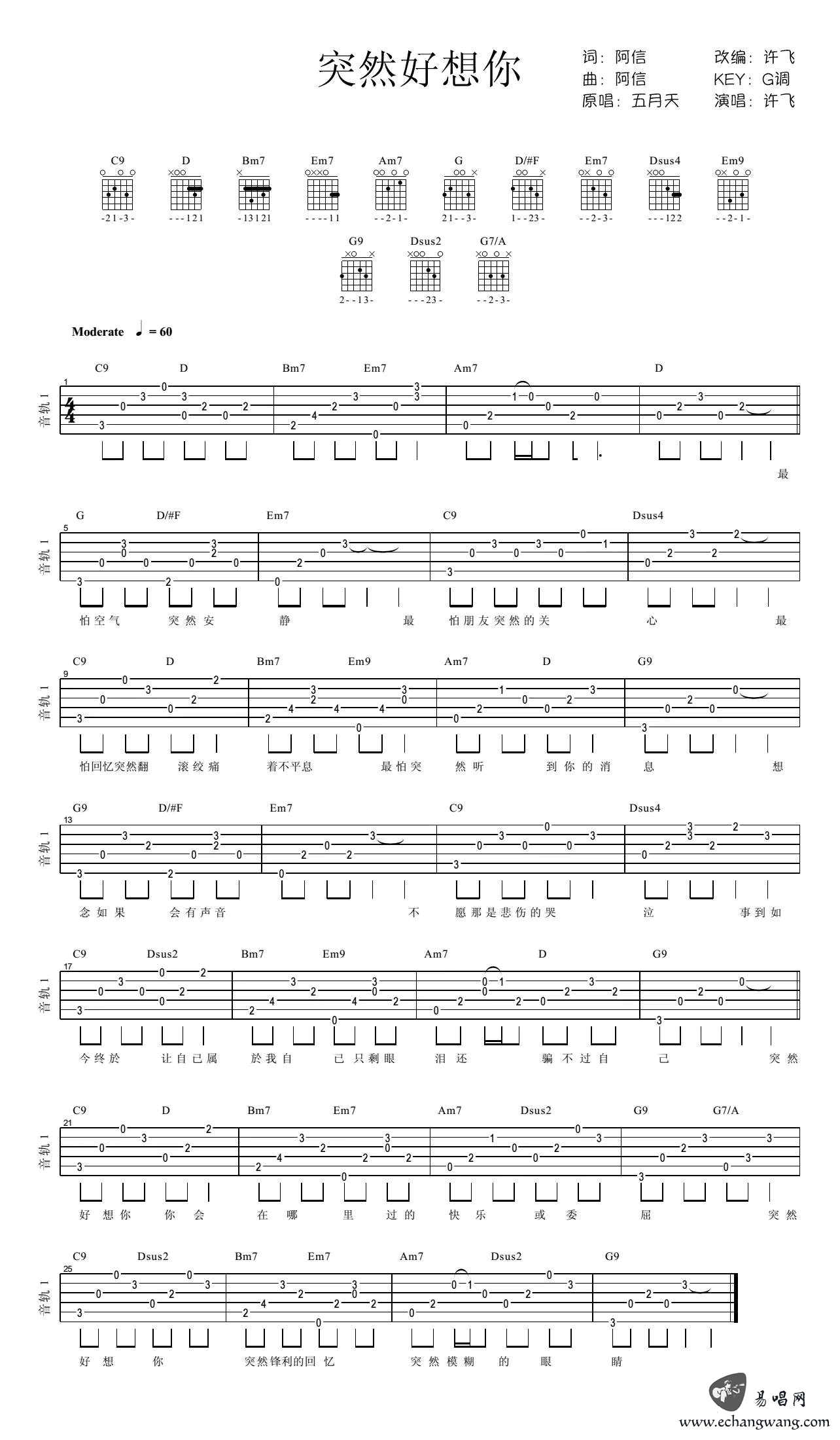 sunbet官网-手机APP下载-易唱网echangwang.com 时间:2017-07-17 来源:许飞 点击:次 突然好想你吉他谱,五月天演唱,本曲谱为许飞的改编版本。突然好想你六线谱,G调高清图片谱,易唱网上传推荐。如果说阿信的《突然好想你》是在撕心裂肺的呼喊,那么许飞的《突然好想你》应该是在孤独的日子分享彼此。附谱附上许飞的《突然好想你》弹唱视频演示,琴友们参照练习。
