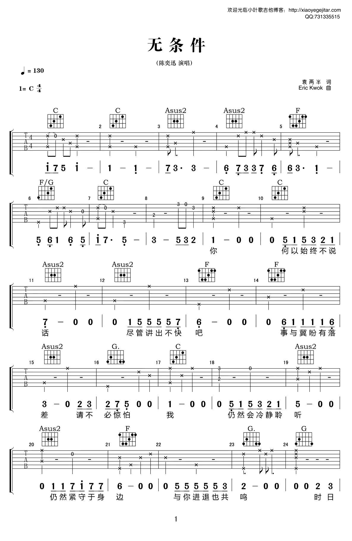 uedbet手机官方登录-手机APP下载-易唱网echangwang.com 时间:2017-07-18 来源:小叶歌 点击:次 陈奕迅无条件吉他谱,C调指法,高清弹唱谱,经典的粤语歌曲,无条件吉他谱,感谢小叶歌吉他编配,完整版五张图片谱子。这首歌有着陈奕迅一贯的情歌风格,总是能用淡淡的歌词,轻轻的旋律刺痛我内心最脆弱的东西。有一种爱是言语无法形容的,是无条件的付出。就算遇到困难,都会守候在对方身边,无条件支持和爱护。 共2页: 上一页12下一页