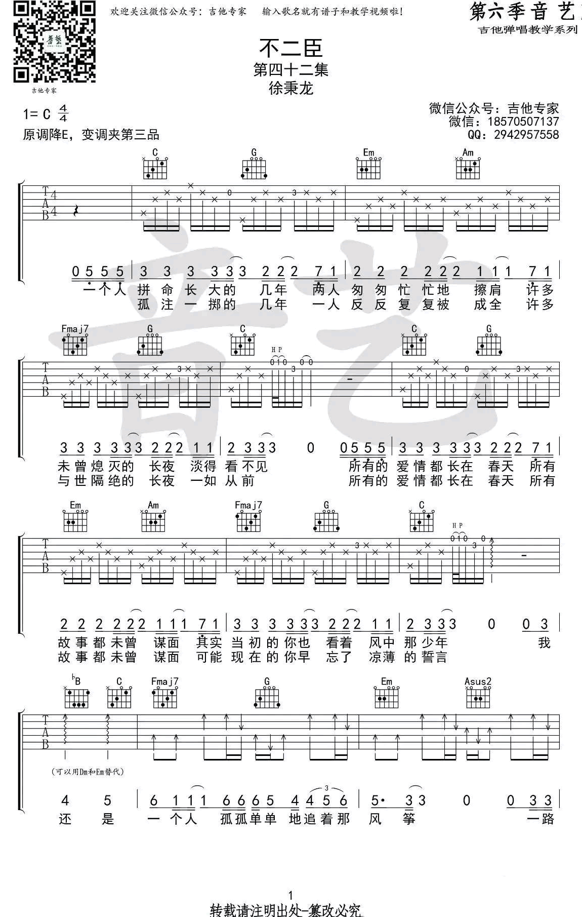 徐秉龙不二臣吉他谱 C调弹唱谱 不二臣六线谱 时间:2017-07-20 来源:音艺吉他 点击:次 不二臣吉他谱,C调弹唱谱,徐秉龙原创歌曲,不二臣六线谱,原调降E,CAPO夹3品,高清图片谱。感谢音艺吉他编配,有人愿意做你的不二臣吗?00后徐秉龙的一首好听的创作,易唱网曲谱推荐收藏。
