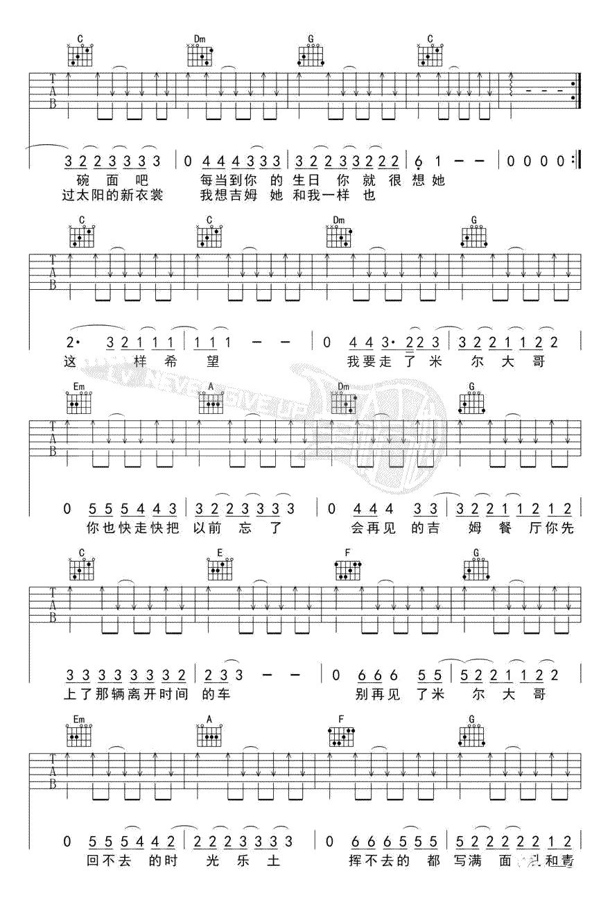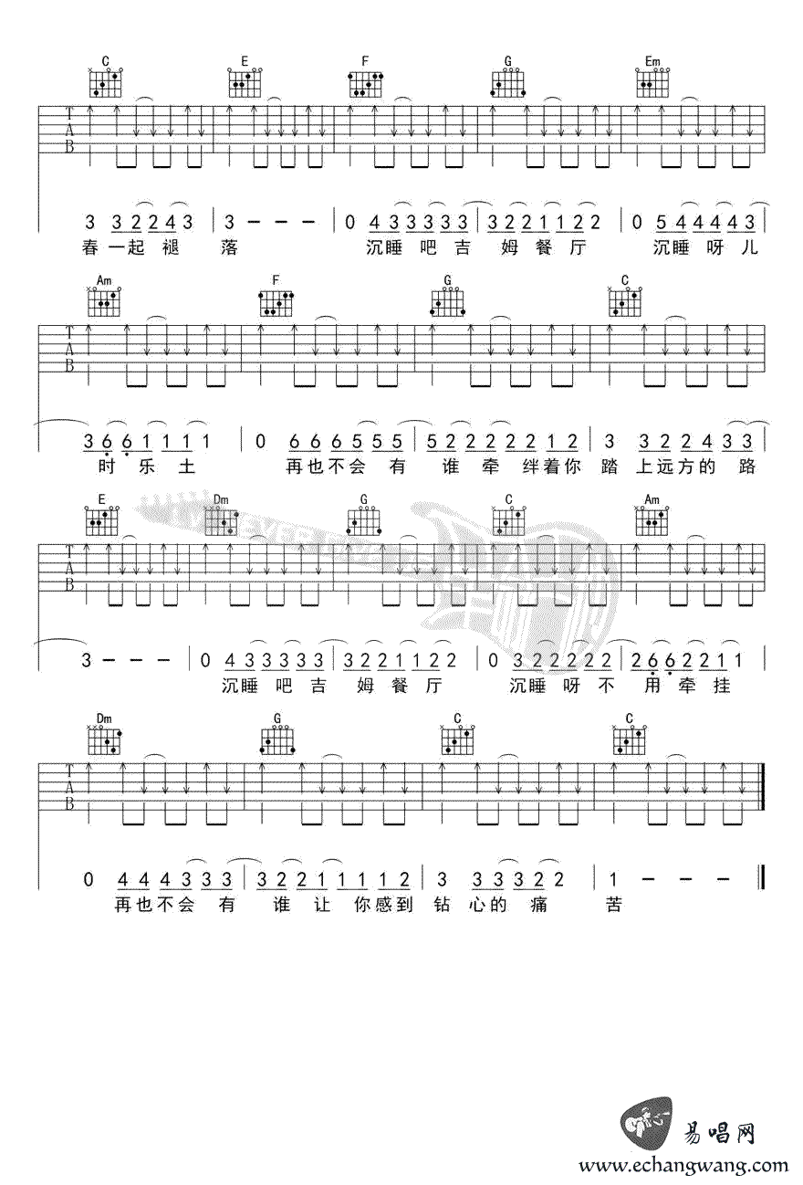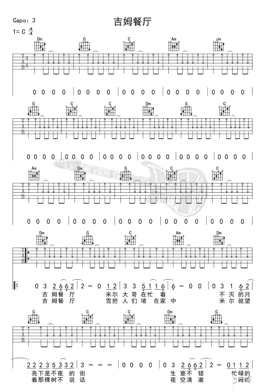 吉姆餐厅吉他谱 赵雷 C调弹唱谱 吉他教学视频 时间:2017-07-23 来源:革命吉他 点击:次 吉姆餐厅吉他谱,赵雷一首原创民谣歌曲,平淡朴实的声调唱出平凡生活的感性。吉姆餐厅六线谱,C调弹唱谱,变调夹夹三品。完整版共四张图片谱例。感谢革命吉他出品,小LV老师带来配套吉他弹唱教学视频。吉他谱由易唱网整理上传。