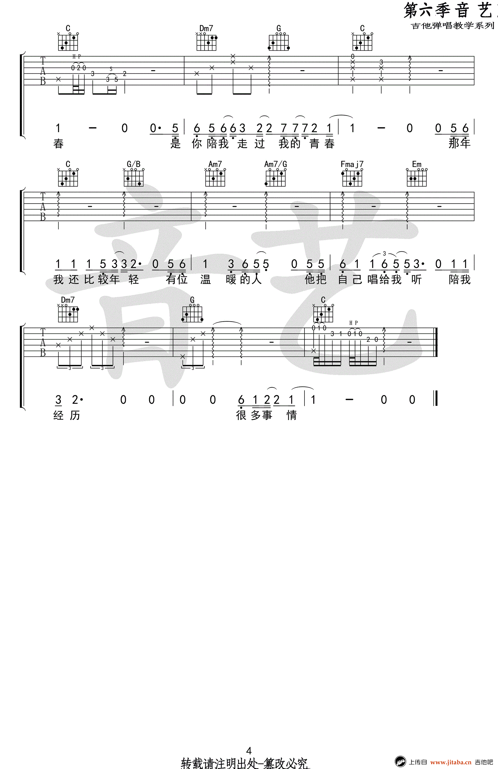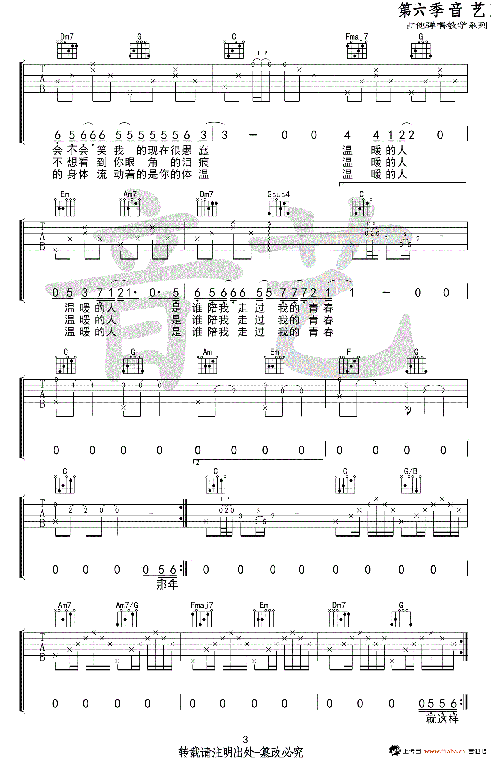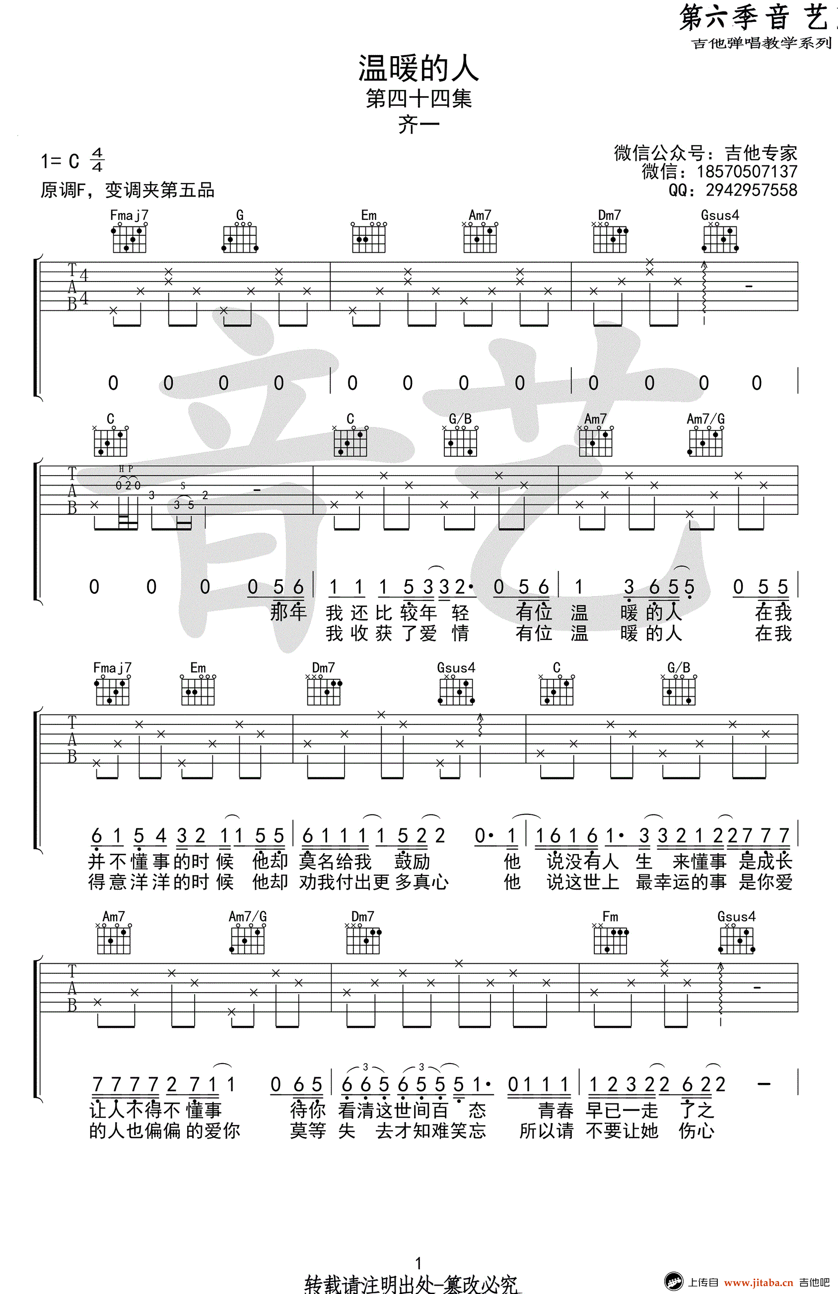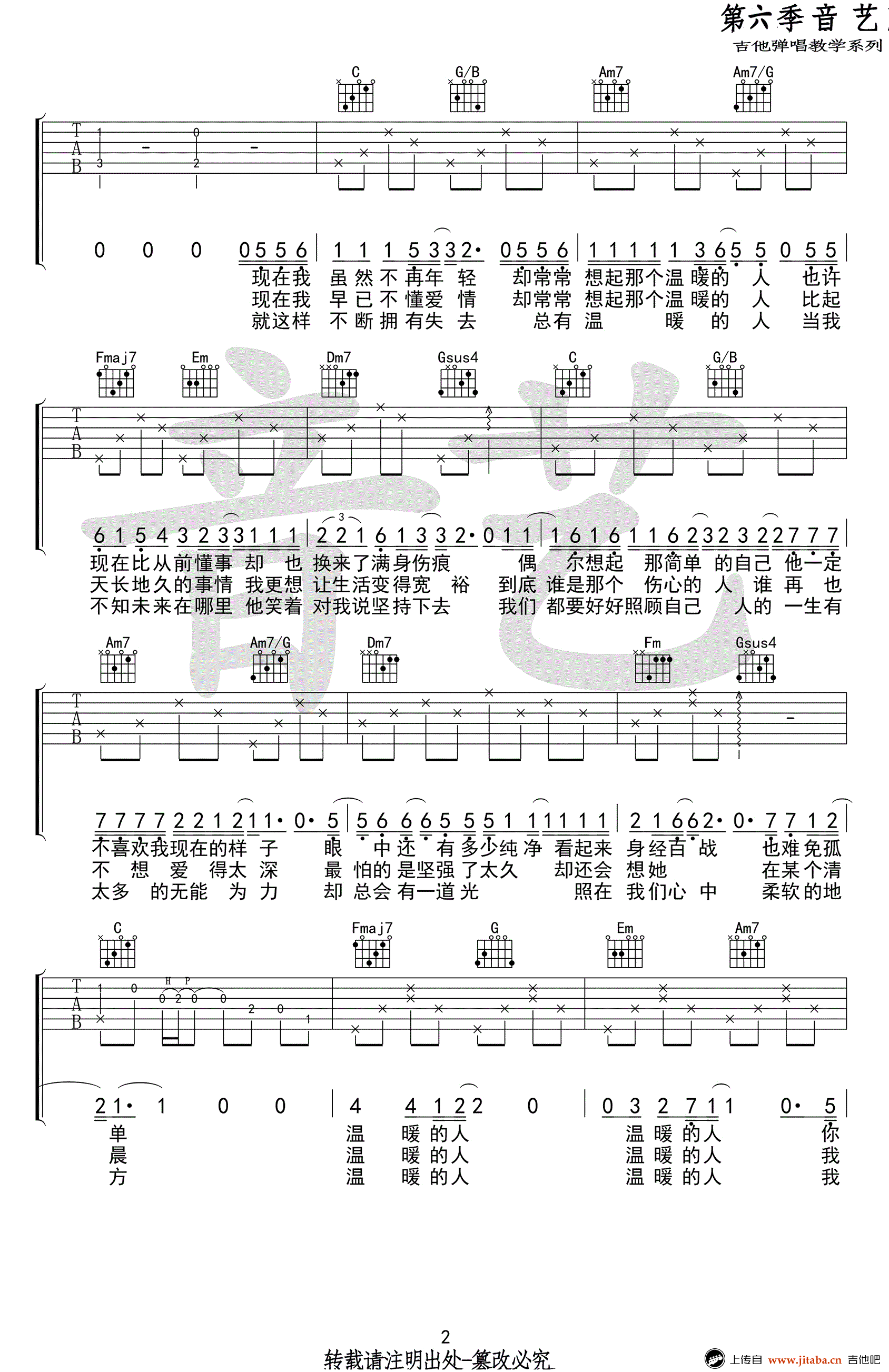 温暖的人吉他谱 齐一 C调六线谱 高清弹唱谱 时间:2017-07-28 来源:音艺吉他 点击:次 齐一《温暖的人》吉他谱,Capo5品,选用C调指法,温暖的人吉他弹唱谱,高清图片六线谱。艺音吉他原版编配曲谱,易唱网分享收藏。在我们的生命里,有许多人,陪着我们走过不同的旅程。有的人让我们懂得友谊、有的人让我们品尝爱情、有的人让我们学会担当。我们的生命就是由不同的关系组成,这些关系无论好坏,都是成就今天的你的必然因素。感谢留下的朋友让我更懂得珍惜,感谢离开的朋友让我学会释然;感谢还在身边的爱人让我相信爱情,感谢错过的前任让我更懂爱情。你们都是我生命里最美好的存在。