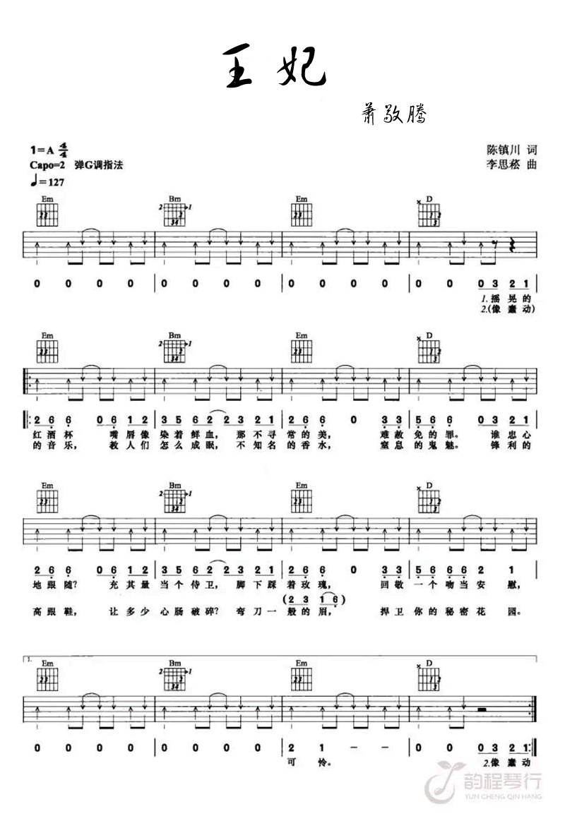 王妃吉他谱 萧敬腾《王妃》六线谱 G调弹唱谱 时间:2017-07-31 来源:网络 点击:次 萧敬腾《王妃》吉他谱,原调A,CAPO夹二品,弹G调指法。王妃六线谱,完整图片谱共四张谱例。雨神萧敬腾的一首代表作品,动感的旋律配上充满力量的声音,这首《王妃》不仅唱出了对于爱情的信念,更唱出了自己对音乐的态度!易唱网吉他谱收藏推荐