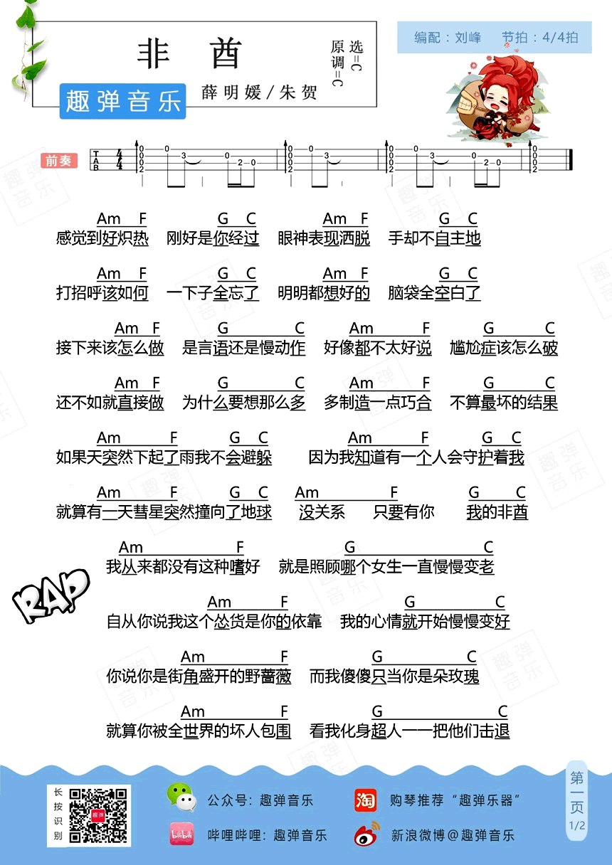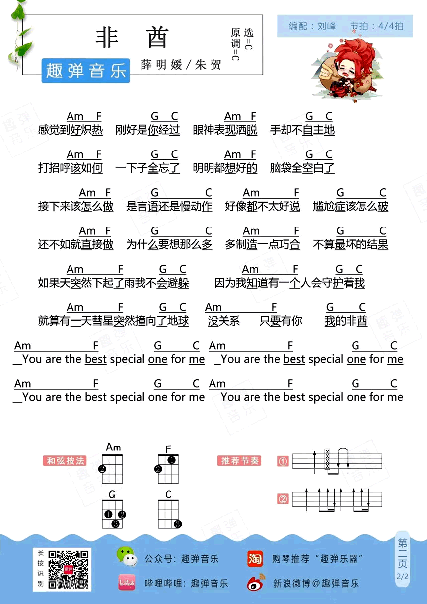 非酋ukulele谱 薛明媛/朱贺《非酋》尤克里里吉他弹唱谱 时间:2017-08-02 来源:趣弹音乐 点击:次 非酋ukulele谱,薛明媛和朱贺演唱,非酋尤克里里吉他弹唱谱,C调指法,两张图片谱例。原指非洲部落酋长,网络用语引申为运气不好的人。赌五毛你们第一次看到歌名会以为这是一首与抽卡游戏有关的歌,然而它居然是一首小情歌!想不到吧,a不amazing?歌中描述的是一个如非酋般倒霉的girl遇上她的真爱小哥哥的故事。非酋自有非酋爱,有了喜欢的人,坏运气小困难都不可怕了~