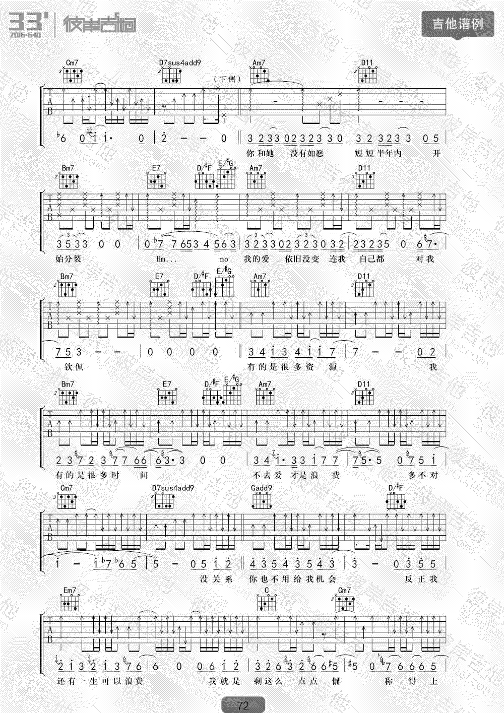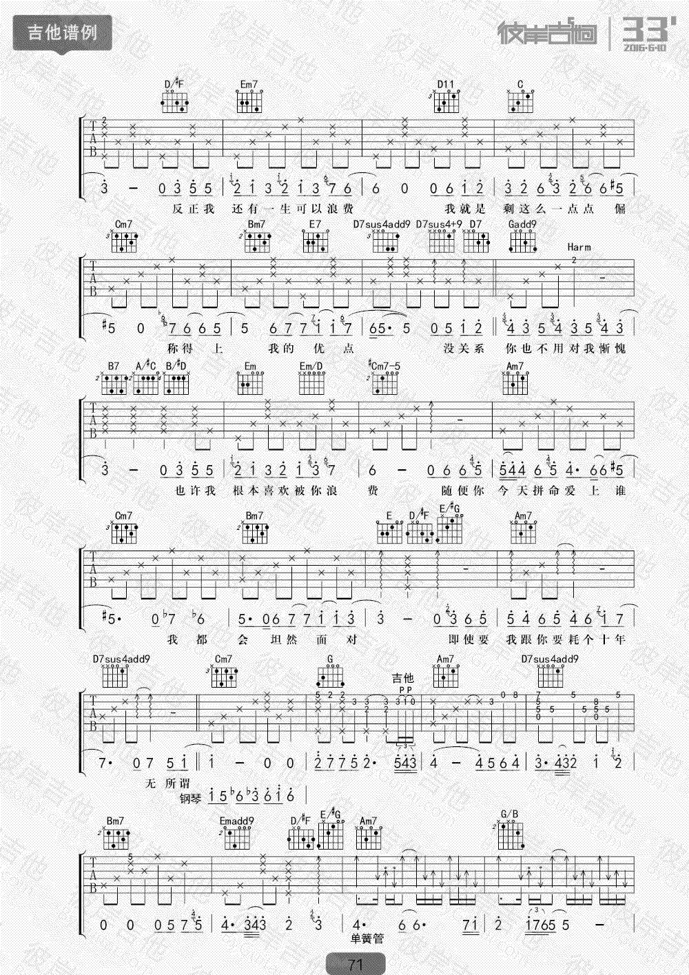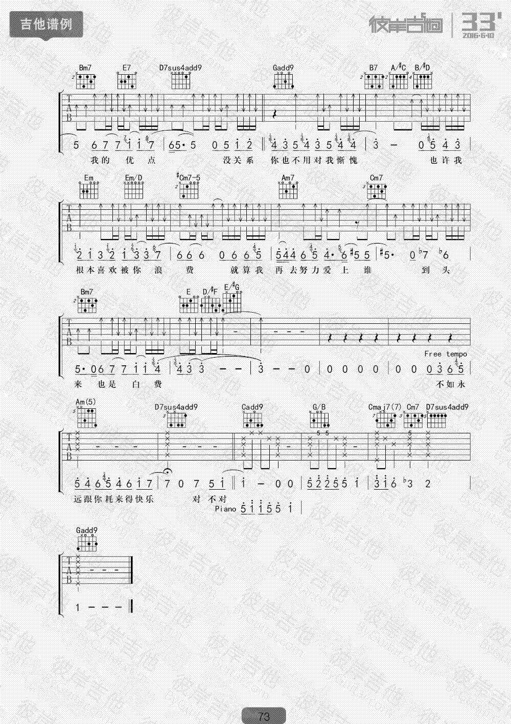 浪费吉他谱 徐佳莹《浪费》吉他教学 视频讲解 时间:2017-08-12 来源:彼岸吉他 点击:次 浪费吉他谱,徐佳莹演唱版本,我是歌手第四季曲目,浪费六线谱,G调指法,完整版共四张图片谱。感谢杨鑫老师编配,易唱网上传收藏。这首歌曲歌声很干净和纯粹,深情细腻的吟唱出了即使知道没有结果也会选择默默地一直无条件的等待下去"的“备胎”主题。喜欢徐佳莹的声音,尤其是听她的这首浪费,在歌声里,听到了落寞与失败,更听到了不打算停止一切无望付出的一腔孤勇,那句没关系,那句都会坦然面对,不是每个人都能说出口的。