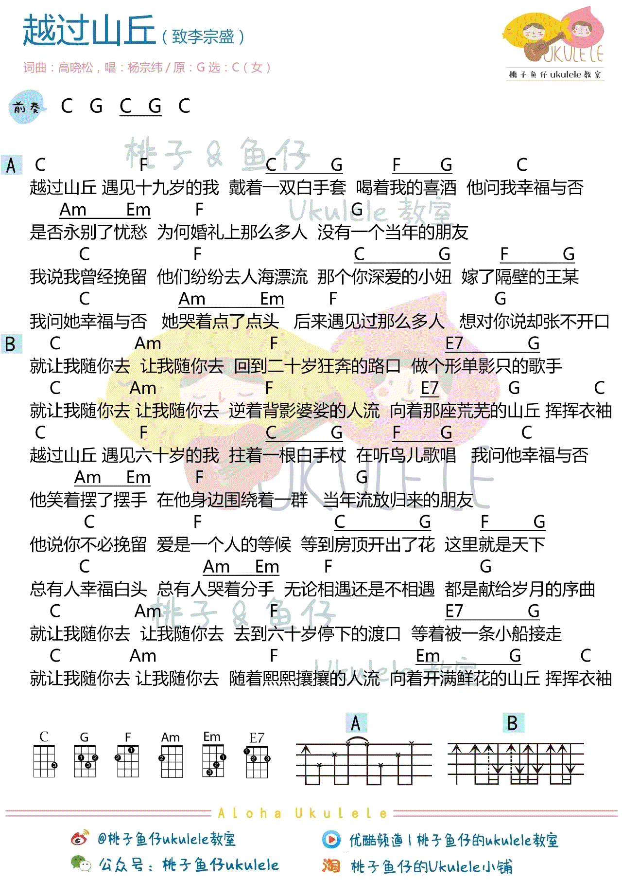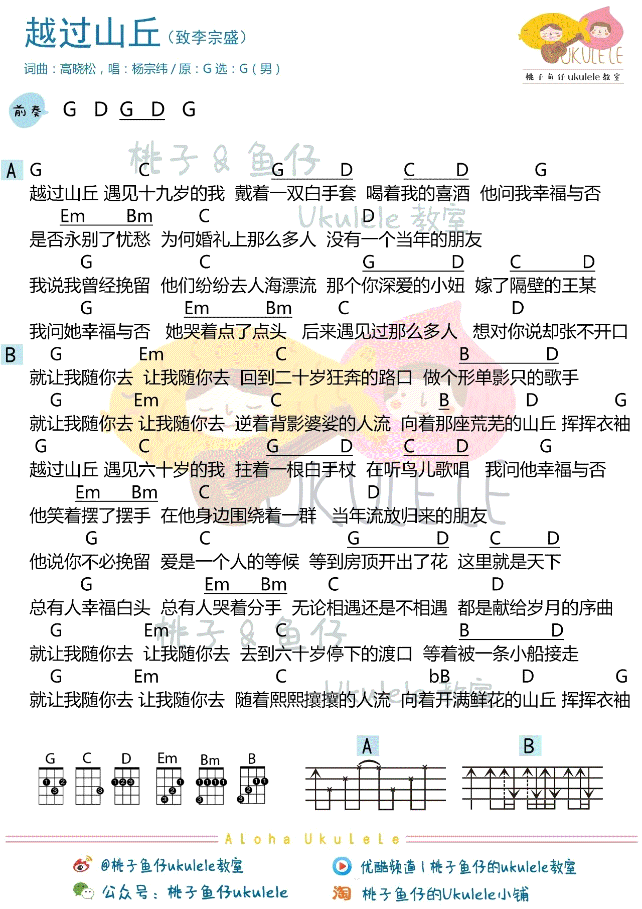 越过山丘ukulele谱 杨宗纬 尤克里里谱 C调女生版+G调男生版 时间:2017-08-23 来源:桃子鱼仔 点击:次 杨宗纬《越过山丘》尤克里里谱,高晓松一曲致敬李宗盛音乐前辈的歌曲,越过山丘ukulele谱,C调女生版和G调男生版,高清弹唱图片谱。感谢桃子鱼仔编配,易唱网整理分享。