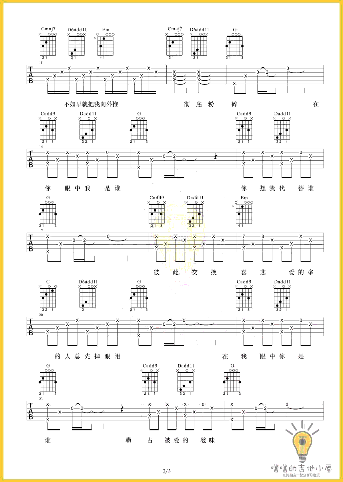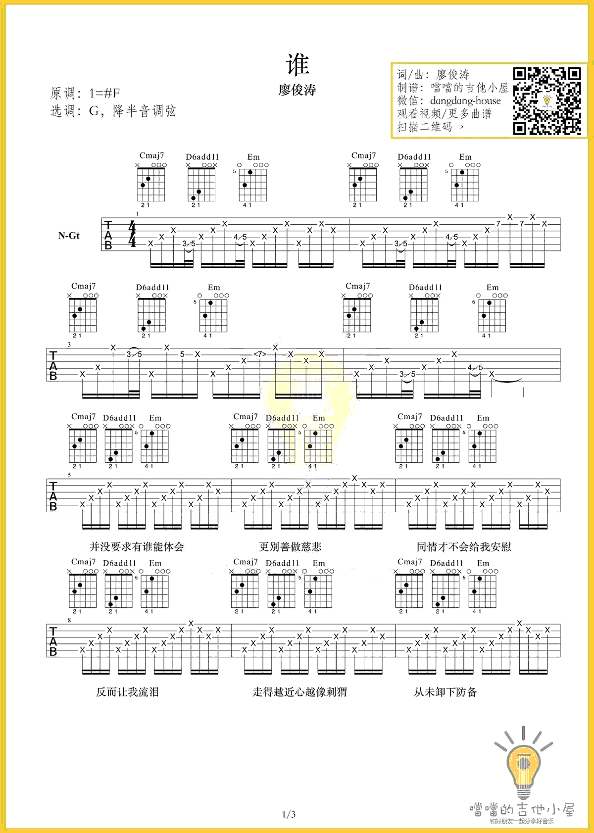 谁吉他谱 廖俊涛《谁》G调弹唱谱 高清六线谱 时间:2017-10-26 来源:噹噹吉他小屋 点击:次 谁吉他谱,明日之子廖俊涛演唱,《谁》弹唱谱,原调#F,选用G调指法,降半音调弦,三张图片谱,六线谱由噹噹吉他小屋编配提供,易唱网整理上传分享。 来自一位00后的弹唱,少年轻拨浅唱,旋律余音缭绕,使人一再沉醉,歌者有心,情至动人。
