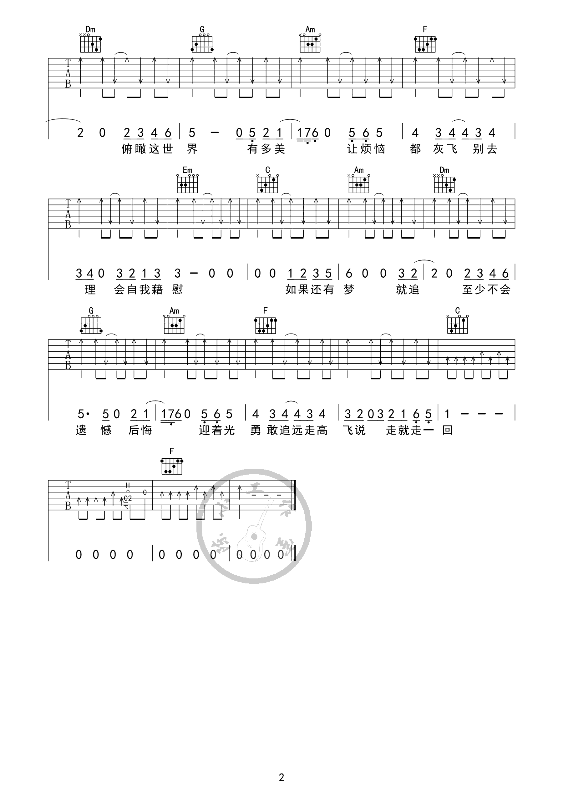 远走高飞吉他谱 金志文 C调弹唱谱 图片谱高清版 时间:2017-11-13 来源:陈小工作室 点击:次 远走高飞吉他谱,金志文热门单曲《远走高飞》吉他弹唱谱,选用C调,原调降E,变调夹夹3品,高清图片谱由陈小工作室的编配和提供,易唱网推荐分享。 我们都渴望远走和高飞,既然实现有点难,不如投入到歌曲当中远走高飞一次,未尝不可。如果迎着风就飞,俯瞰这世界有多美,让烦恼都灰飞,别去理会。踩着这样的节奏我已远走高飞。