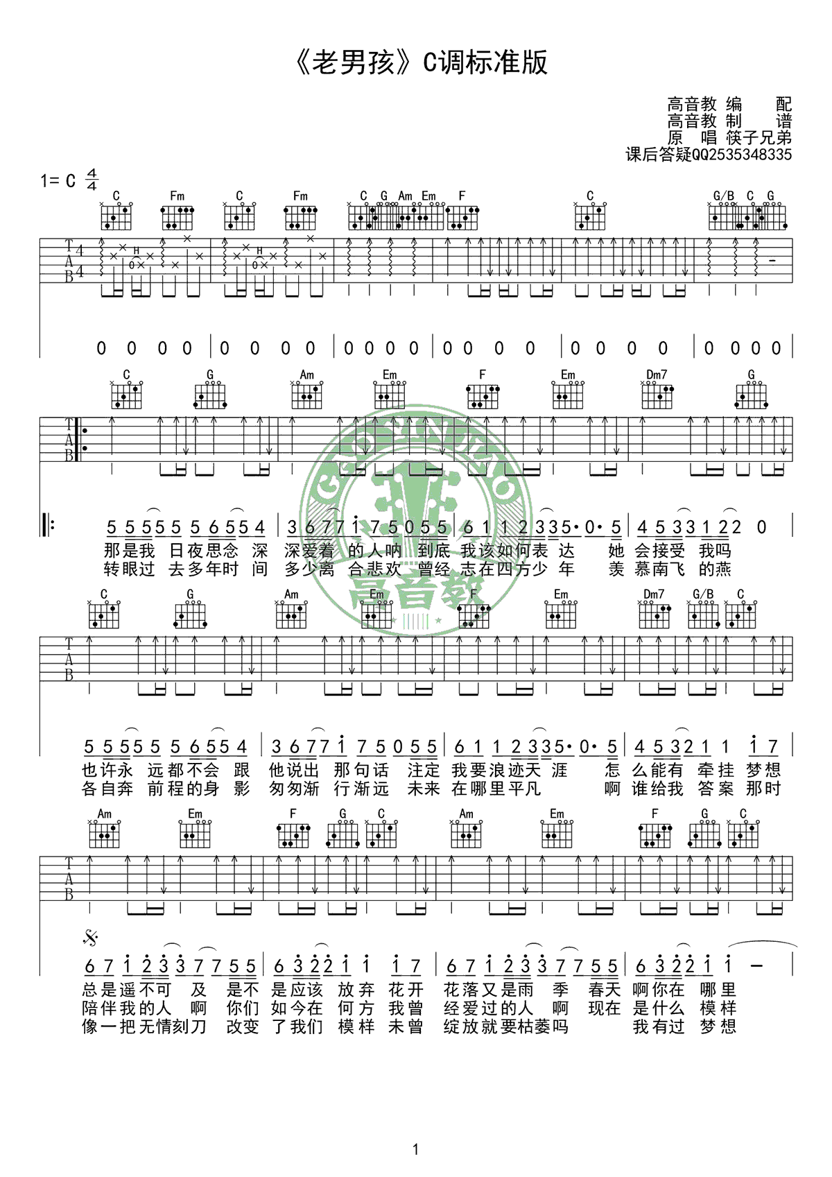 筷子兄弟《老男孩》吉他谱 C调标准版 弹唱教学视频 时间:2017-12-02 来源:高音教 点击:次 老男孩吉他谱,筷子兄弟演唱,一首红遍大江南北的热门歌曲,博取了无数人的泪水,梦想这东西和经典一样,永远不会因为时间而褪色。《老男孩》六线谱,三张高清图片谱,选用C调指法,感谢高音教的编配和提供教学示范视频,易唱网为大家整理推荐分享。