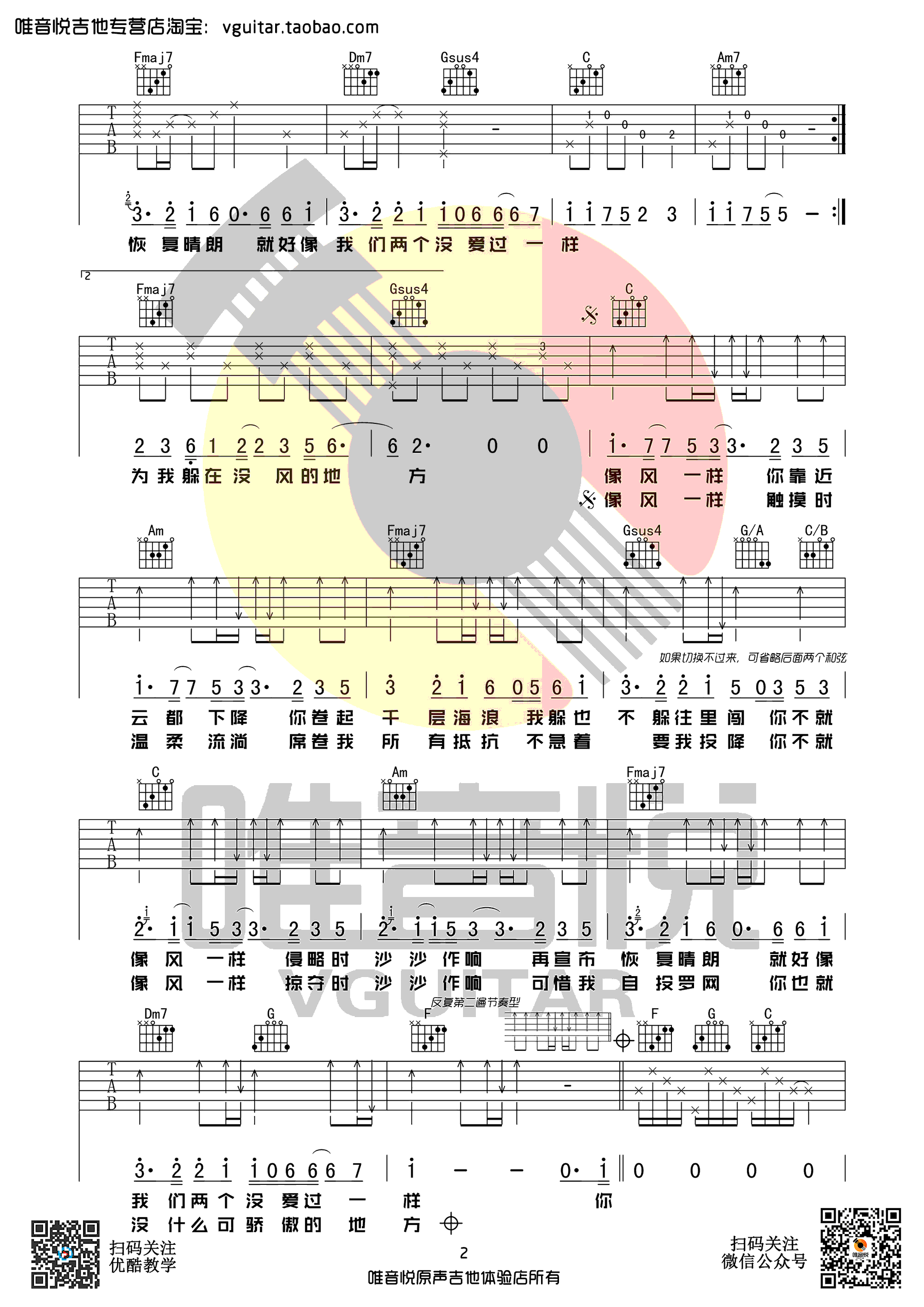 万博体育手机版首页-手机APP下载-易唱网echangwang.com 时间:2017-12-05 来源:唯音悦 点击:次 薛之谦《像风一样》吉他谱六线谱,三张高清图片谱,原调D调,选用C调,变调夹夹2品,女生变调夹可以夹5品。同学们可根据个人嗓音调整。感谢唯音悦的编配和提供,易唱网薛之谦吉他谱推荐分享。 一首忧伤的薛氏情歌,旋律舒缓轻柔像风一样轻抚脸颊,坐下来安静弹唱,沉浸在歌声营造那种情绪里,让我们不仅拥有了观望别人故事的读者视角,也仿佛体味到了风的方向。