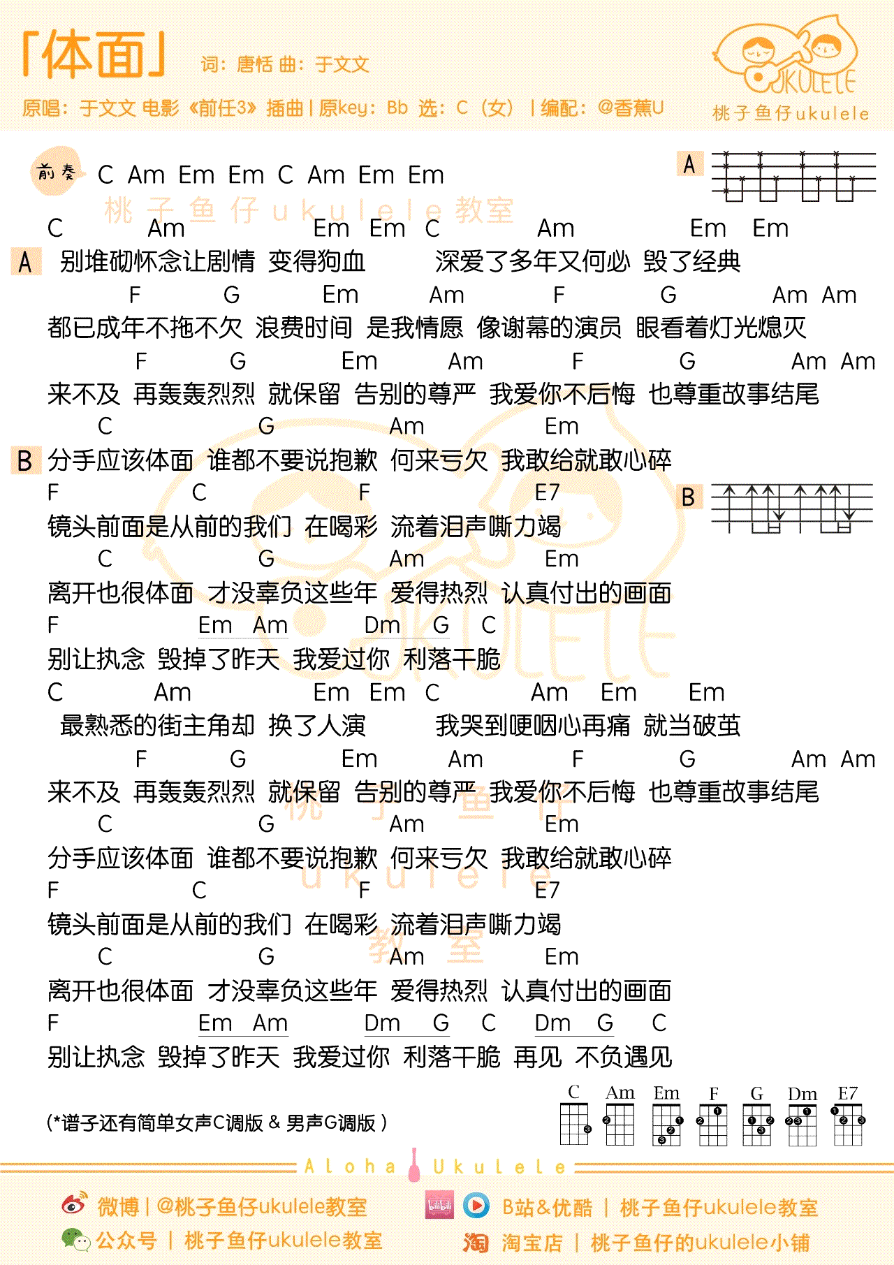 体面ukulele谱 于文文《体面》尤克里里谱 弹唱教学视频 时间:2018-01-10 来源:桃子鱼仔 点击:次 于文文体面ukulele谱,电影《前任3》插曲,体面尤克里里谱,感谢香蕉老师为大家编配三个版本,包括选用C调指法调女生版,原版Bb调,以及G调男生版,3个版本谱 各取所需~。随谱附上《体面》ukulele弹唱教学视频,同学们收藏练习吧。