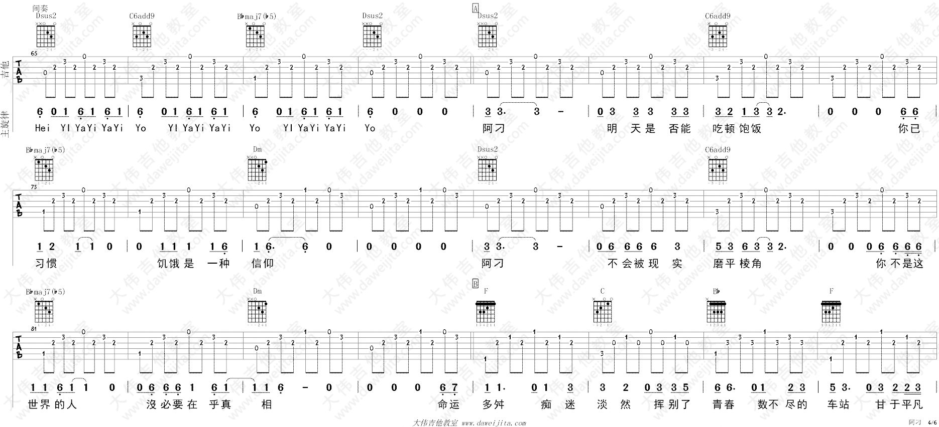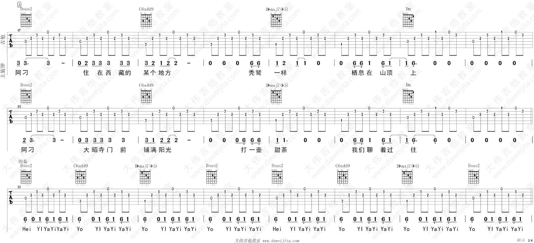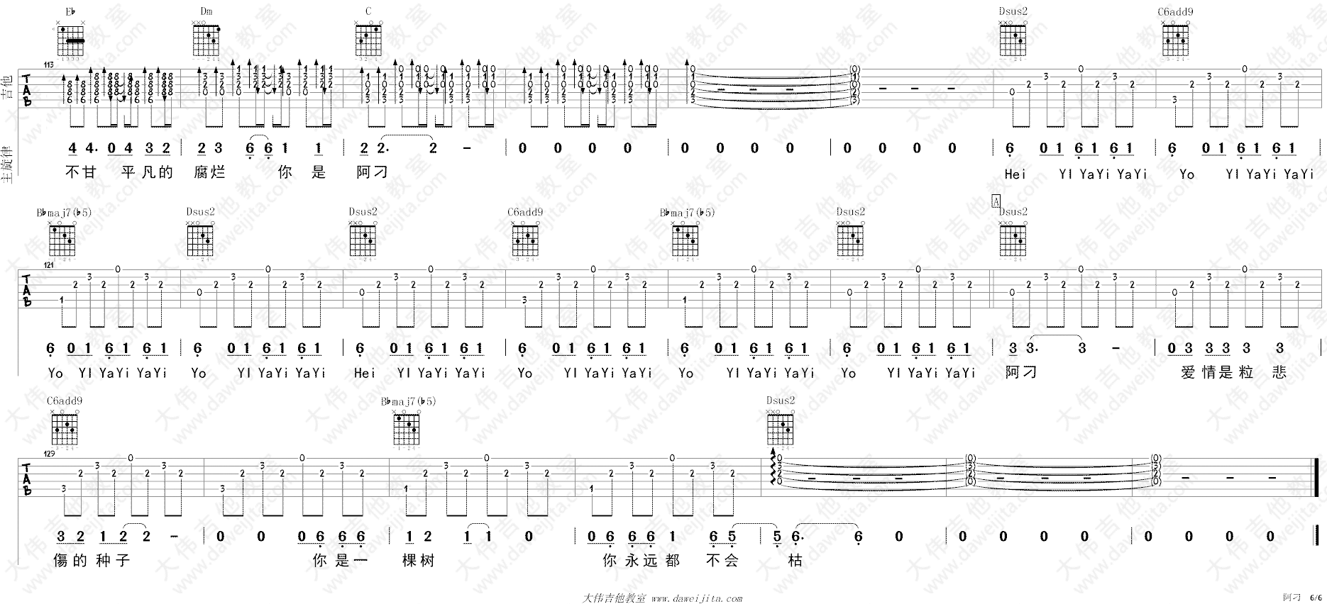 阿刁吉他谱 张韶涵/赵雷 高清图片谱 吉他弹唱示范视频 时间:2018-03-05 来源:大伟吉他教室 点击:次 阿刁吉他谱,赵雷原唱,《阿刁》六线谱,本曲谱为男生调,变调夹夹1品,F调指法,女生推荐变调夹5品,大伟吉他教室的编配和提供的弹唱演示,易唱网推荐分享。 这首歌曲是张韶涵歌手第二季的第二期演唱歌曲,惊艳耀眼现场版,仿佛歌唱是经历过命运多舛后的自已,既高亢又嘹亮,给大众呈现的是蜕变后的自已。 《阿刁》吉他弹唱示范演示: