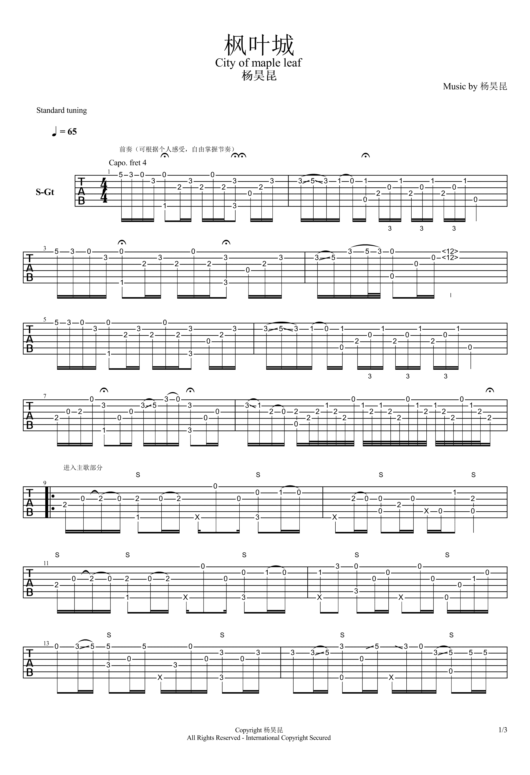 k66.com-手机APP下载-易唱网echangwang.com 时间:2018-04-03 来源:杨昊昆 点击:次 枫叶城指弹吉他谱,杨昊昆作曲并演奏的一首中国风指弹吉他曲,枫叶城吉他指弹独奏谱,三张高清图片谱。易唱网分享上传。 据说,这首曲子的灵感源自枫叶之都,作者的家乡本溪。纯朴的曲风,优美的旋律,没有过多的演奏技巧,却融入了对家乡深沉的爱恋感情。
