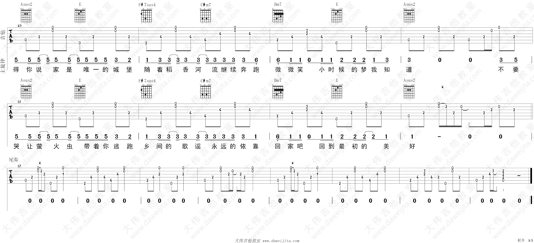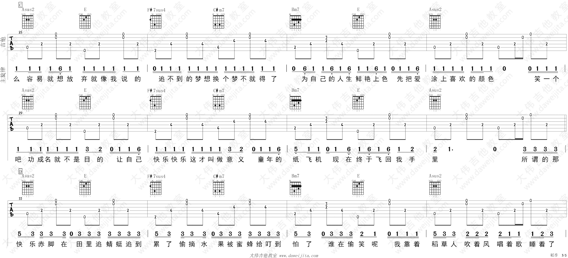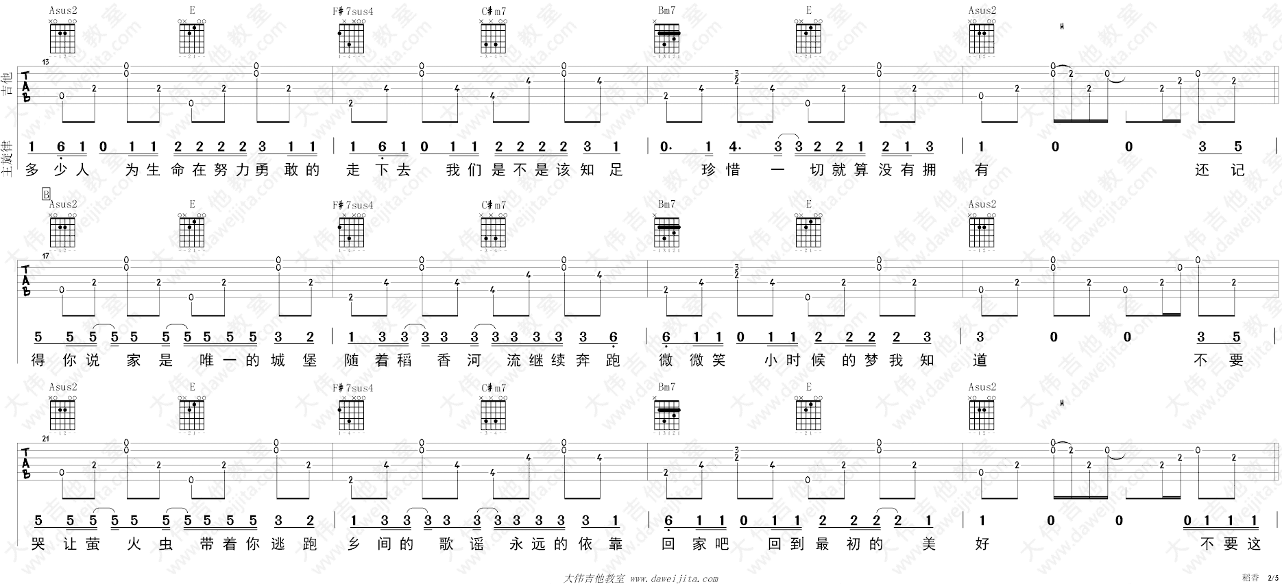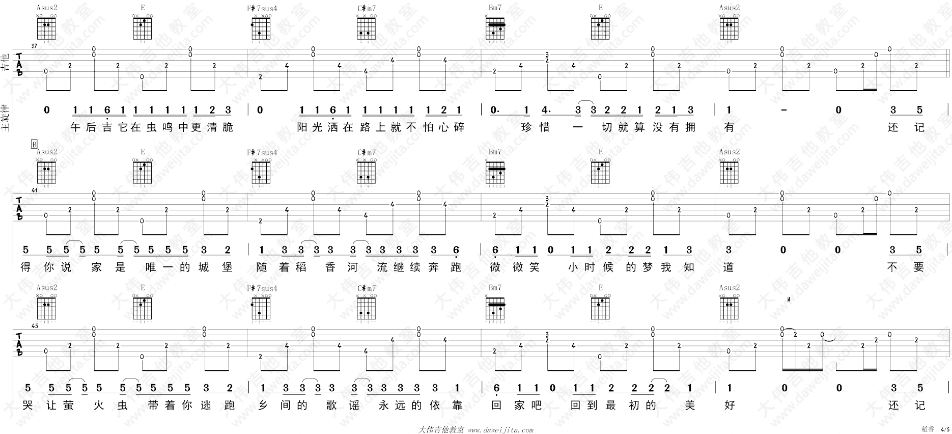 稻香吉他谱 周杰伦 新编男生版 《稻香》吉他弹唱演示 时间:2018-04-11 来源:大伟吉他教室 点击:次 稻香吉他谱,周杰伦演唱,《稻香》六线谱,五张高清图片谱,新编男生版谱,原调Ab,选用A调,为了和原曲的指法一致,所有琴弦都降了半个音,女生弹唱建议变调夹夹第5品。感谢大伟吉他教室的编配和提供的弹唱演示视频,易唱网推荐分享。 近来有一波00后合唱团采用的阿卡贝拉无伴奏(就是无乐器或无背景音乐的意思)合唱和杯子敲打节拍谱写了这首《稻香》,令不少网友感到惊叹不已。今天我们用吉他也来弹唱一曲吧。 《稻香》吉他弹唱演示示范: