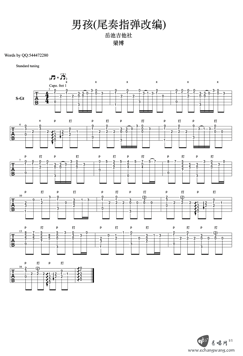 万象城体育-手机APP下载-易唱网echangwang.com 时间:2018-04-26 来源:岳池吉他社 点击:次 男孩吉他谱,梁博原创作品《男孩》尾奏指弹谱,高清图片六线谱,感谢岳池吉他社的编配,易唱网更新,为吉他爱好者收藏分享。 其实每个男人内心都是孩子,都需要一个人来让他成长。当他经历过那种因为无能为力,而最终落得遗憾的时候,才会真正想努力变得强大起来。和你分享这首男孩指弹,愿你早会学会弹奏。