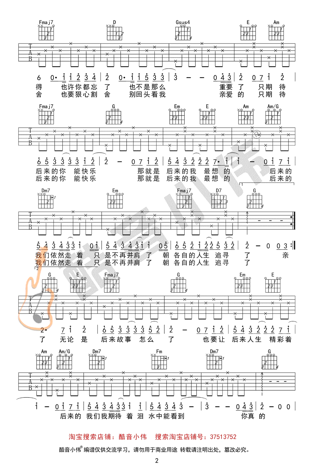 后来的我们吉他谱 C调简单版 五月天 酷音小伟版 时间:2018-05-02 来源:酷音小伟 点击:次 后来的我们吉他谱,五月天献唱电影《后来的我们》主题曲,后来的我们吉他弹唱六线谱,简单版编配,原调G,选用C,男生变调夹推荐7品,女生变调推荐0到2品。感谢酷音小伟的编配,易唱网推荐分享。 电影褒贬不一,但从那个年代走过的人看,内心会得到更多的共鸣,理解电影中的她们如同当年那么走过的我们,可后来的我们也未必就学会了更好的去爱一个人。