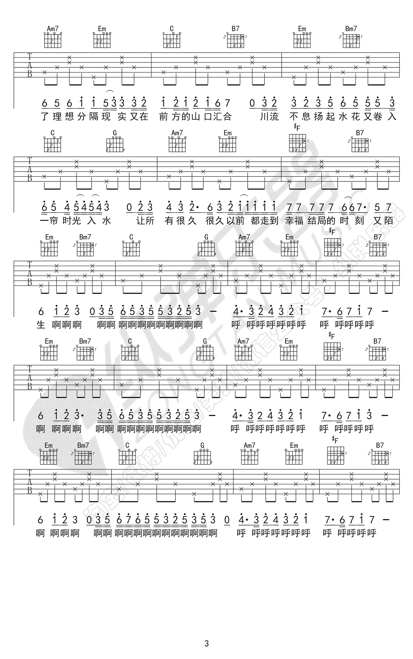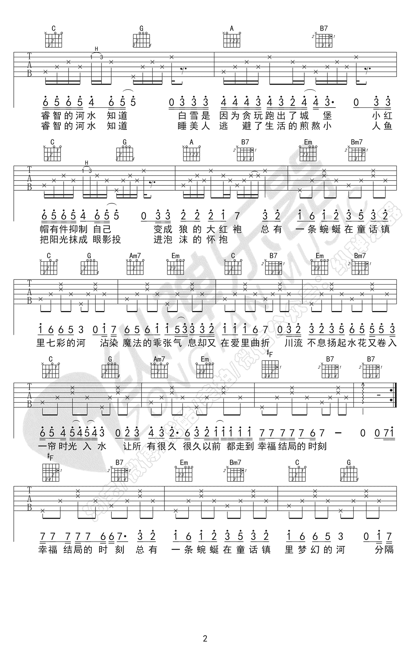 童话镇吉他谱 陈一发儿 G调指法 高清六线谱 时间:2018-05-13 来源:纵弹乐器 点击:次 童话镇吉他谱,斗鱼直播平台主播陈一发儿翻唱,来自暗杠词曲创作的一首歌曲,童话镇六线谱,四张完整高清图片谱,选用G调指法,变调夹夹5品,纵弹乐器的编配,易唱网每日更新,推荐分享。 总有一条蜿蜒在童话镇里七彩的河,沾染魔法的乖张气息,却又在爱里曲折,川流不息扬起水花,又卷入一帘时光入水。真是充满童话的色彩,如果真有这么一个童话镇,生活中会少却许多烦恼吧?