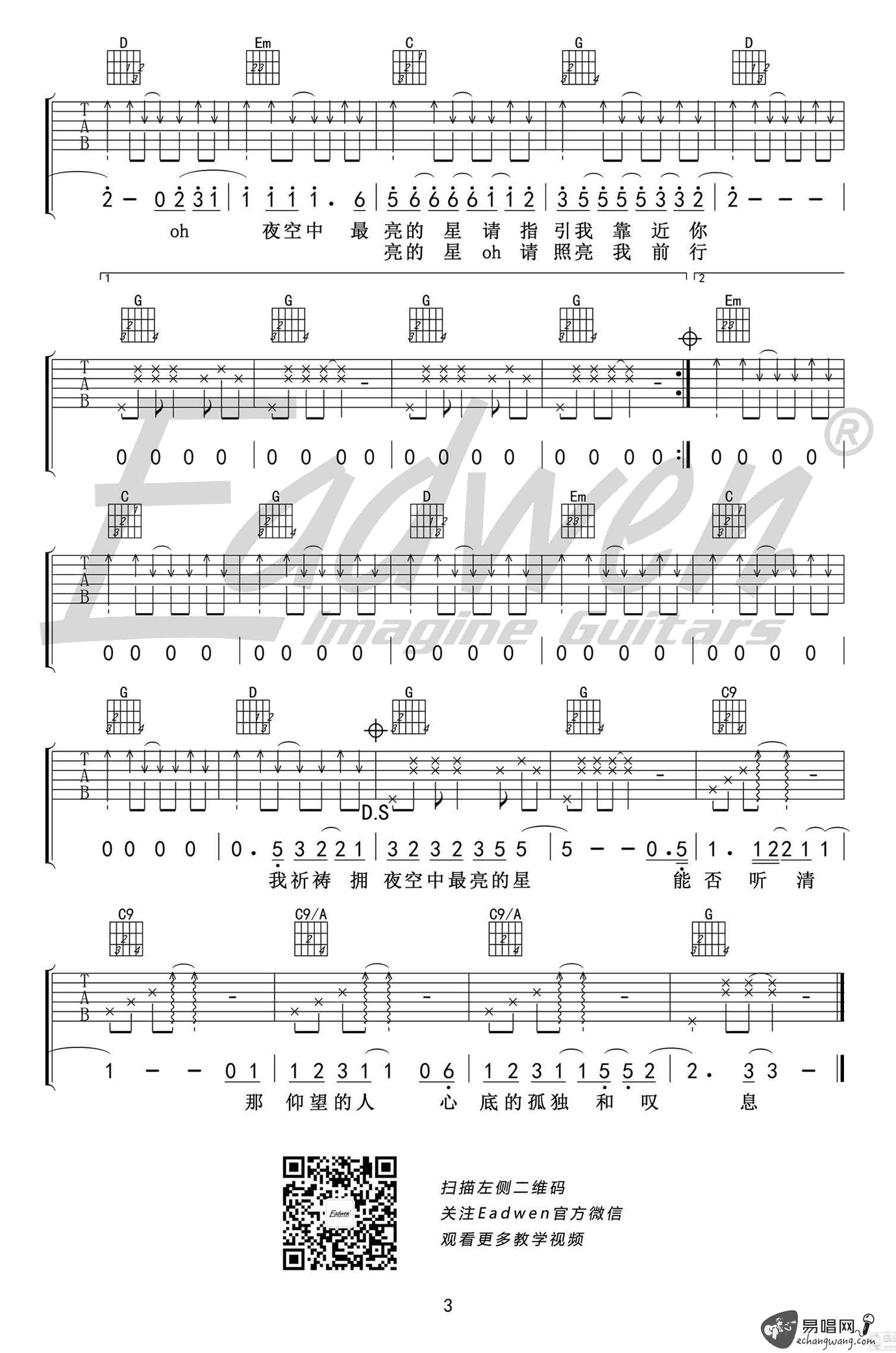 夜空中最亮的星吉他谱 逃跑计划 C调弹唱谱 吉他教学视频 时间:2018-06-06 来源:爱德文吉他教室 点击:次 夜空中最亮的星吉他谱,逃跑计划的一首经典代表歌曲,原调B,选用G调指法,变调夹夹4品,《夜空中最亮的星》吉他六线谱,高清图片谱,感谢爱德文吉他教室的编配,并提供弹唱演示和教学视频,欢迎吉他爱好者收藏分享。 这首励志歌曲呈现出来的浪漫与情怀,恬静与意境,都着实的令人感动。那些对于梦想的追寻和理想的的坚持,曾经年少的我们也都曾努力过。 《夜空中最亮的星》吉他教学视频: