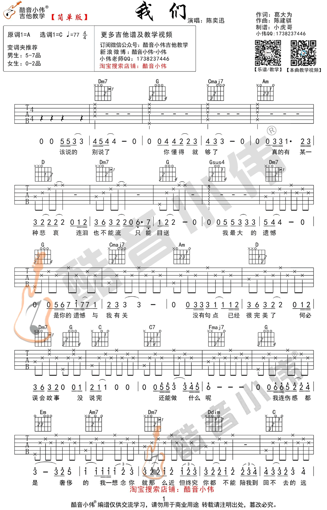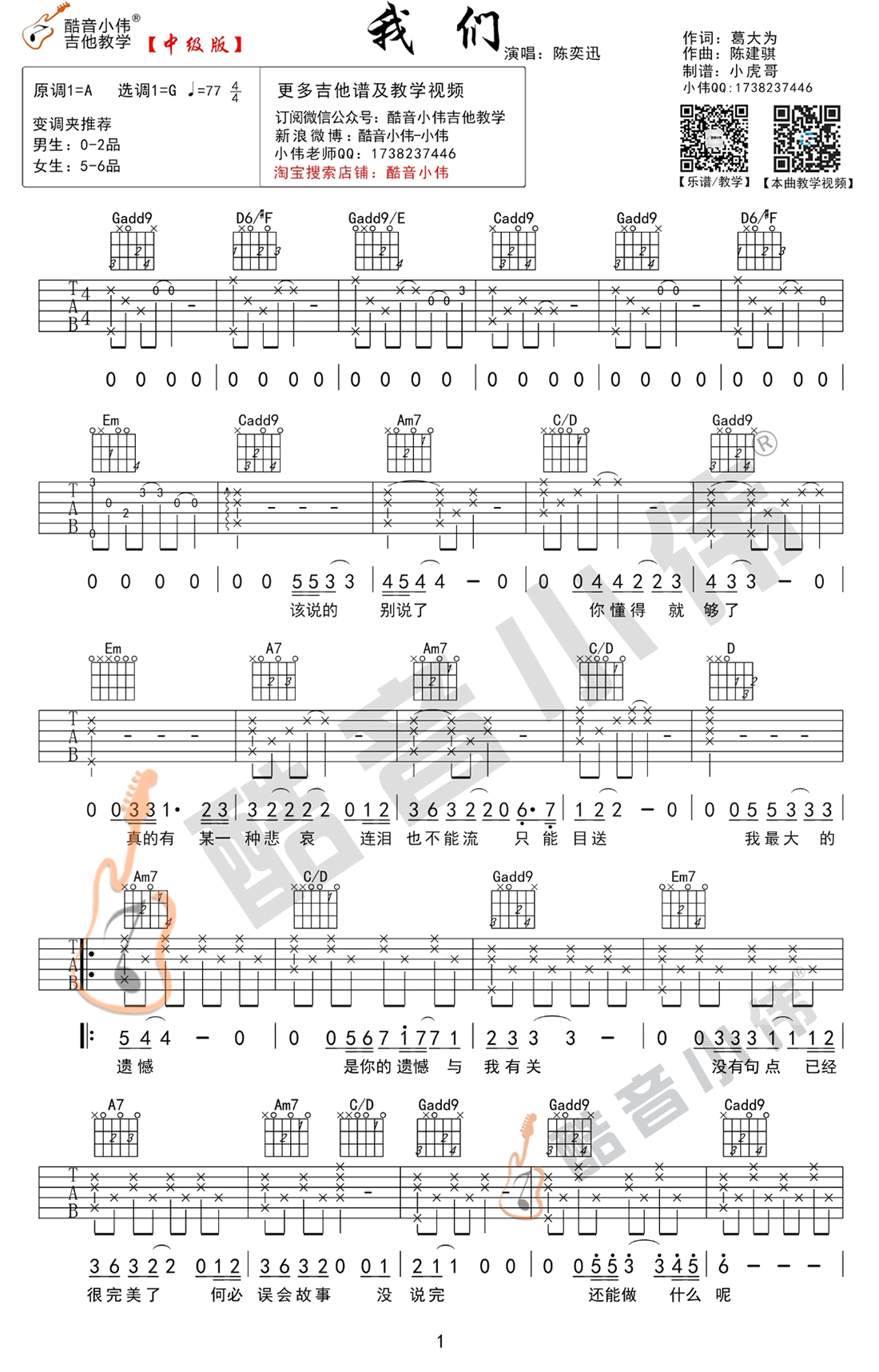 我们吉他谱 陈奕迅 《后来的我们》主题曲 吉他弹唱教学 时间:2018-07-13 来源:酷音小伟 点击:次 我们吉他谱,陈奕迅献唱电影《后来的我们》主题曲,《我们》六线谱,两个版本编配,G调指法中级版+C调指法简单版,吉他弹唱图片由酷音小伟的编配和提供,同步上传配套弹唱演示视频教学讲解,易唱网推荐分享。十年的情感纠缠化为这首我们。请聆听弹唱。让我们从琴声中听到,自己的回忆和故事。学习歌曲弹唱的步骤。先熟练弹会歌曲的和弦伴奏,能够熟练清唱出整首歌曲,最后弹唱结合此歌曲。 《我们》吉他教学视频: G调指法中级版吉他谱 C调指法简单版