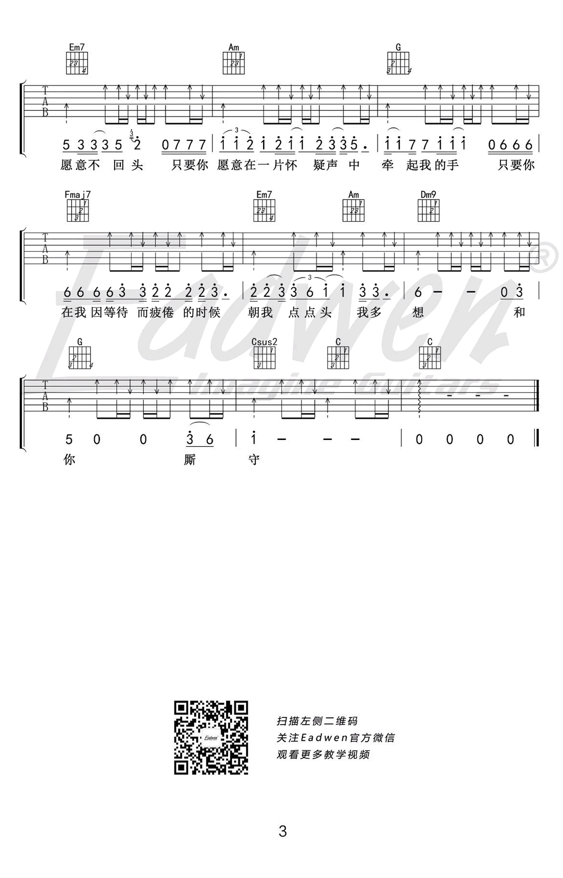 私奔吉他谱,曾轶可词曲演唱,C调弹唱谱,变调夹夹二品为原调,私奔六线谱,高清图片谱,感谢爱德文吉他教室编配,并为同学们带来吉他弹唱教学视频,易唱网整理分享。多少人都想拉着那个最爱的ta,来一场轰轰烈烈的私奔。每一种爱都值得被祝福,郑钧的《私奔》更多是少年肆意与洒脱,而曾轶可的《私奔》则多了几分压抑与苦闷,正是因为困难太多,才更加珍惜。只要你愿意跟我走,只要你愿意不回头,只要你愿意在一片怀疑声中牵起我的手,只要你在我因等待而疲倦的时候朝我点点头。不管你想与谁私奔,我都祝你早安午安和晚安。