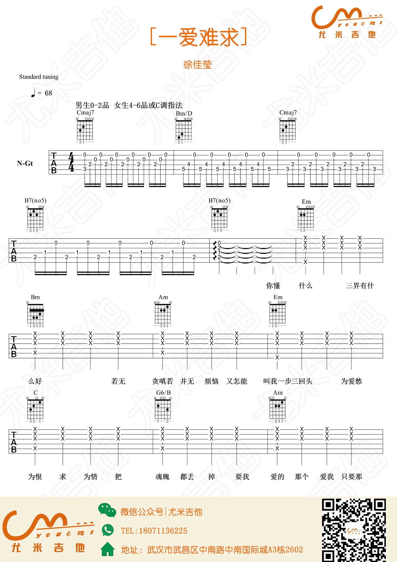 一爱难求吉他谱 徐佳莹 C调 电视剧《扶摇》片尾曲 时间:2018-07-31 来源:尤米吉他 点击:次 一爱难求吉他谱,徐佳莹演唱,电视剧《扶摇》的片尾主题曲,《一爱难求》吉他弹唱谱,C调指法,男生变调夹0-2品,女生变调夹4-6品,尤米吉他编配,并提供配套吉他弹唱视频演示,易唱网推荐分享。 婉转琵琶缓缓勾勒出诗意韵味,徐佳莹荡气回肠的声声发问,激荡起情绪的阵阵涟漪,扶摇与无极并肩成长,蒲苇磐石的爱情故事随着歌曲的律动如画卷般铺陈开来。 《一爱难求》吉他弹唱视频: