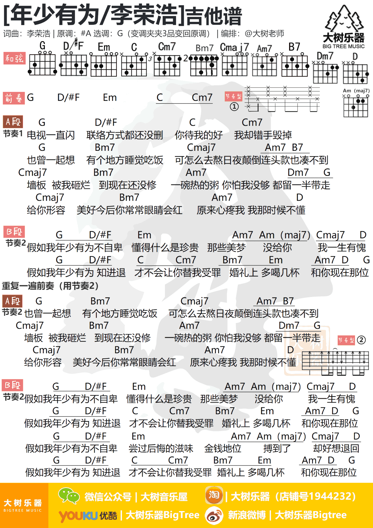 年少有为吉他谱 李荣浩 吉他弹唱演示+教学视频 时间:2018-09-22 来源:大树乐器 点击:次 年少有为吉他谱,李荣浩演唱,原调#A,选调G,变调夹夹三品变回原调,大树老树老师编配分享,并为同学们带来《年少有为》吉他弹唱示范和教学视频,易唱网分享上传。 吉他教学视频