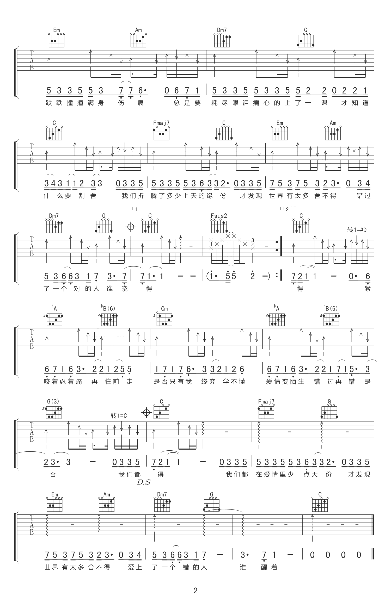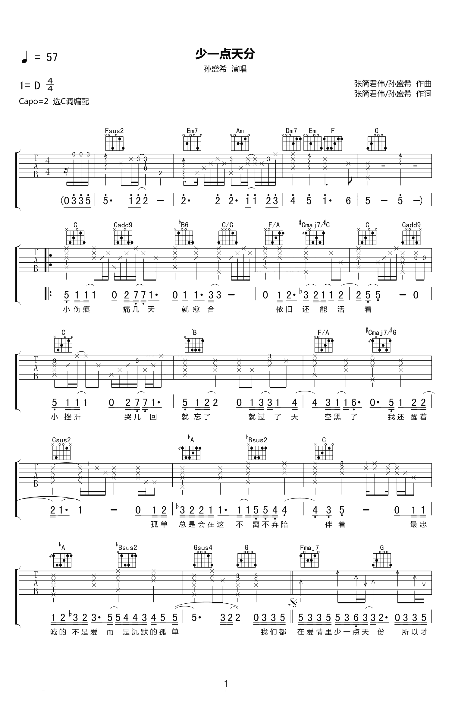 少一点天分吉他谱 孙盛希/王贰浪 C调弹唱谱 图片谱 时间:2018-10-30 来源:网络 点击:次 孙盛希 少一点天分吉他谱, 原调D,CAPO夹二品,选用C调编配,Tvbs偶像剧《俏摩女抢头婚》片尾曲。王贰浪的抖音翻唱歌曲,少一点天分六线谱,易唱网上传分享。 我不知道遇见你是对是错,但我知道遇见你我开心过。这首歌描述的是两个爱着人,到最后却没有在一起。无论从歌曲还是歌词,都能让听者感受到那份无奈和心酸。