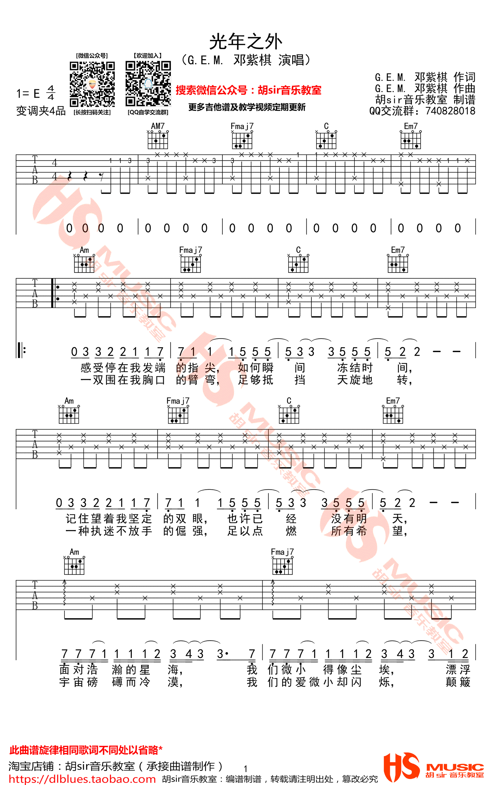 光年之外吉他谱 邓紫棋 E调六线谱 吉他弹唱视频 时间:2018-11-06 来源:胡sir 点击:次 光年之外吉他谱,E调六线谱,好莱坞电影《太空旅客》中文主题曲,邓紫棋演唱,光年之外六线谱,高清图片谱,胡sir编配,易唱网上传分享。附配套吉他弹唱视频,喜欢这首歌曲的同学们可以参照老师的示范演示练习。