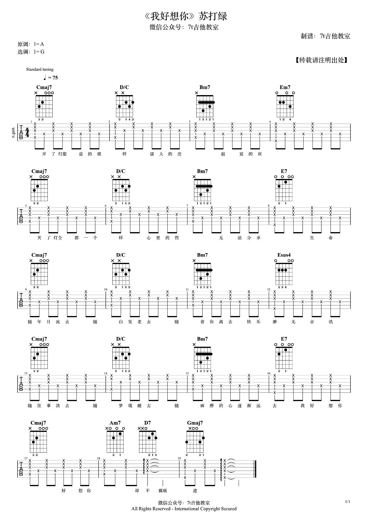 我好想你吉他谱 苏打绿 G调弹唱谱 《小时代》主题曲 时间:2018-11-20 来源:7t吉他教室 点击:次 我好想你吉他谱,苏打绿演唱的一首情歌,我好想你吉他弹唱谱,高清图片六线谱,《我好想你》的原调是A大调,这里用了G大调的指法来弹奏,想唱原调的琴友需要夹变调夹第2品哦。感谢7t吉他教室编配,易唱网上传。 一首很走心的演绎,仿佛是用尽了所有的深情,该曲被选为电影《小时代》、《小时代2:青木时代》的主题曲。