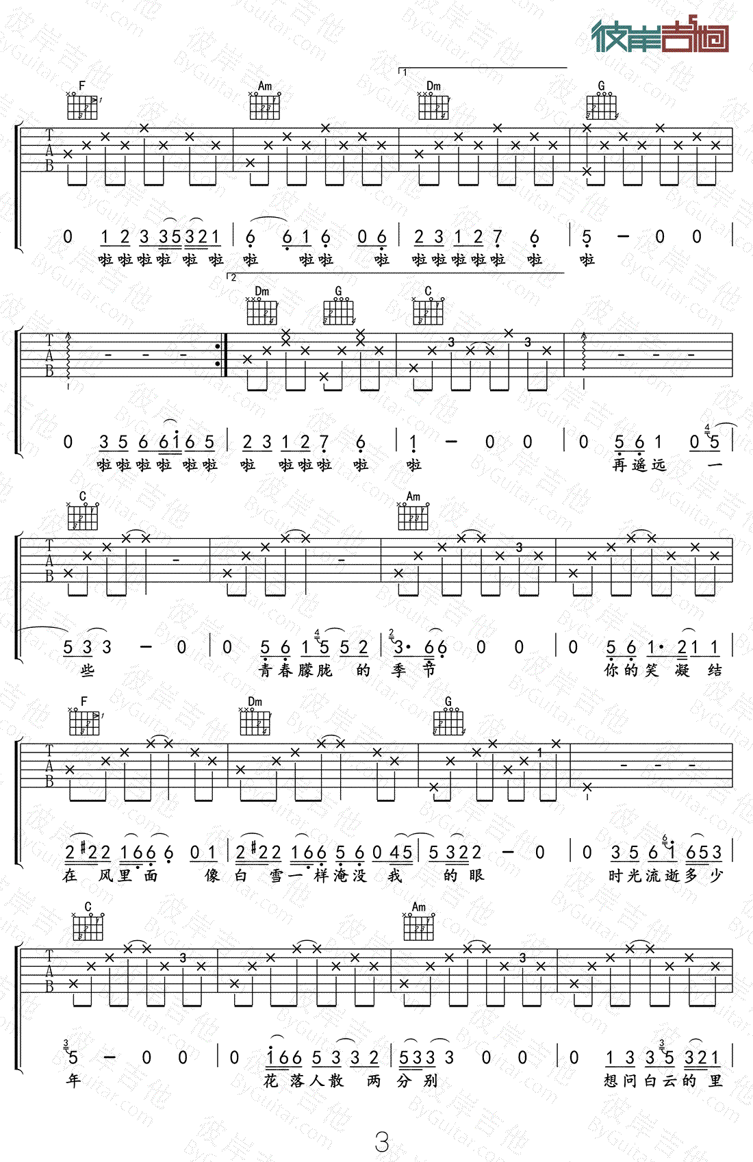 浪客秦昊《冬》吉他谱 好妹妹乐队 吉他弹唱视频 时间:2018-11-21 来源:小宁 点击:次 冬吉他谱,好妹妹乐队浪客秦昊演唱版本,C调指法编配,男生变调夹夹第三品。冬六线谱,完整编配共四张高清图片谱子,感谢彼岸出品小宁制谱,易唱网整理上传。随谱附上秦昊参加《我是传奇》节目的现场吉他弹唱视频, 要打动人的心弦,歌唱并不是必须得大吼大叫,撕心裂肺。有的时候,轻声细语的吟唱,用一把吉他弹上几个简单的和弦,效果可能会更好。