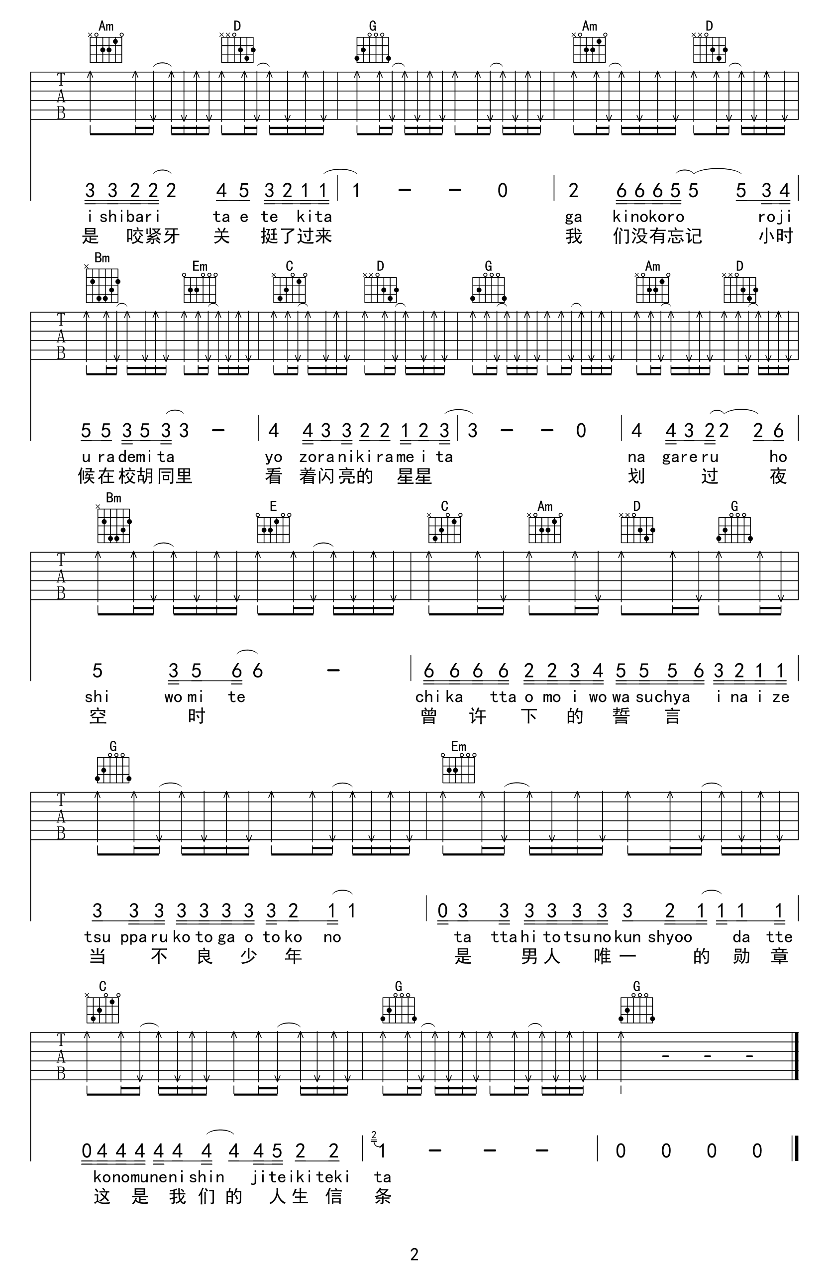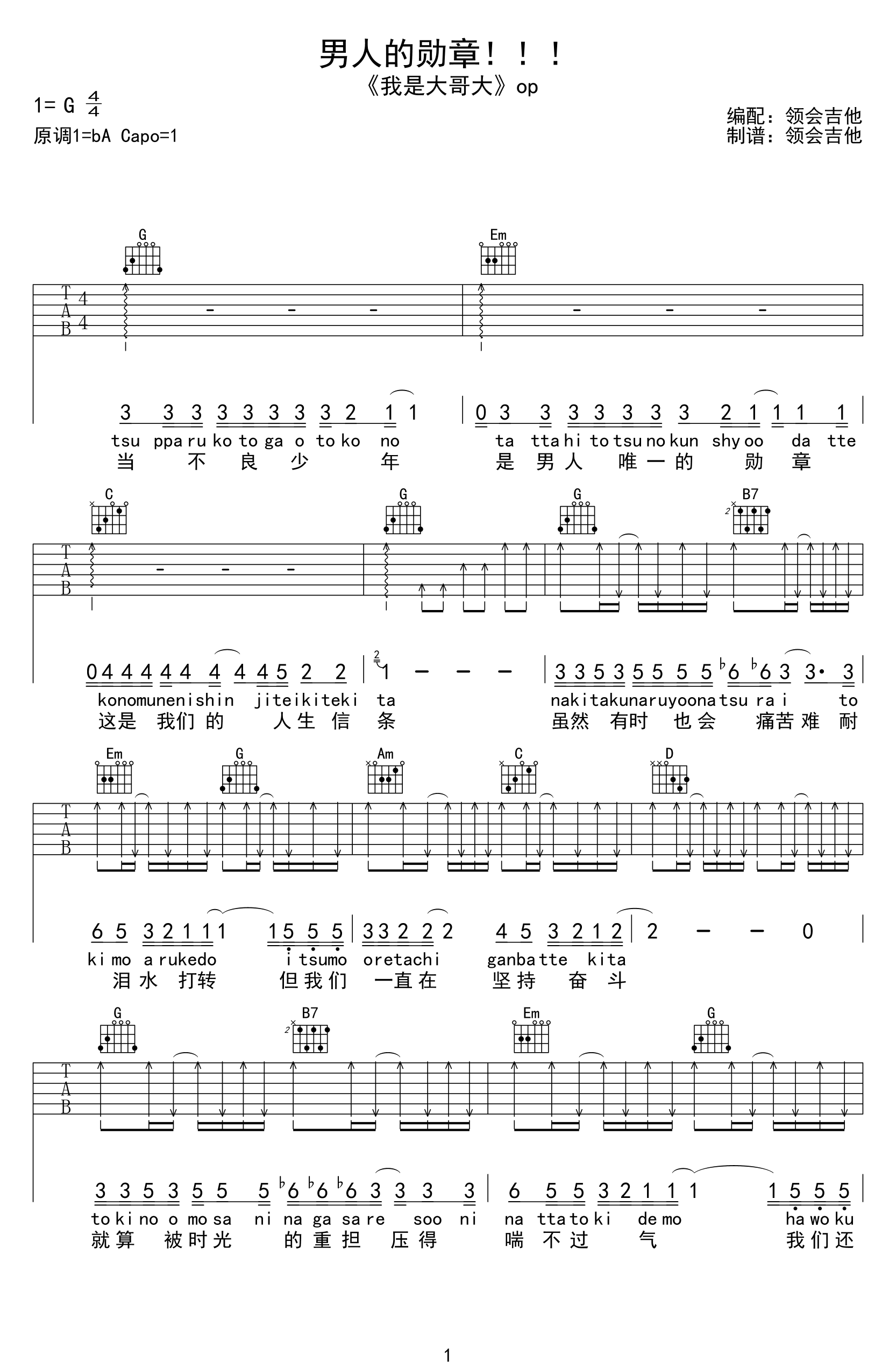 男人的勋章吉他谱 日剧《我是大哥大》主题曲 音译歌词 时间:2018-12-29 来源:领会吉他 点击:次 男人的勋章吉他谱,带音译歌词,漫改日剧《我是大哥大》主题曲,男人の勋章六线谱,G调指法,CAPO夹一品,高清图片谱,领会吉他编配,易唱网上传分享。 不知道最近琴友们有没有看「今日から俺は」(我是大哥大)这部快乐源泉喜剧呢?片头曲乐队由主演们结成“今日俺バンド”演唱。这首歌是八十年代年由嶋大輔演唱,传唱度很高。