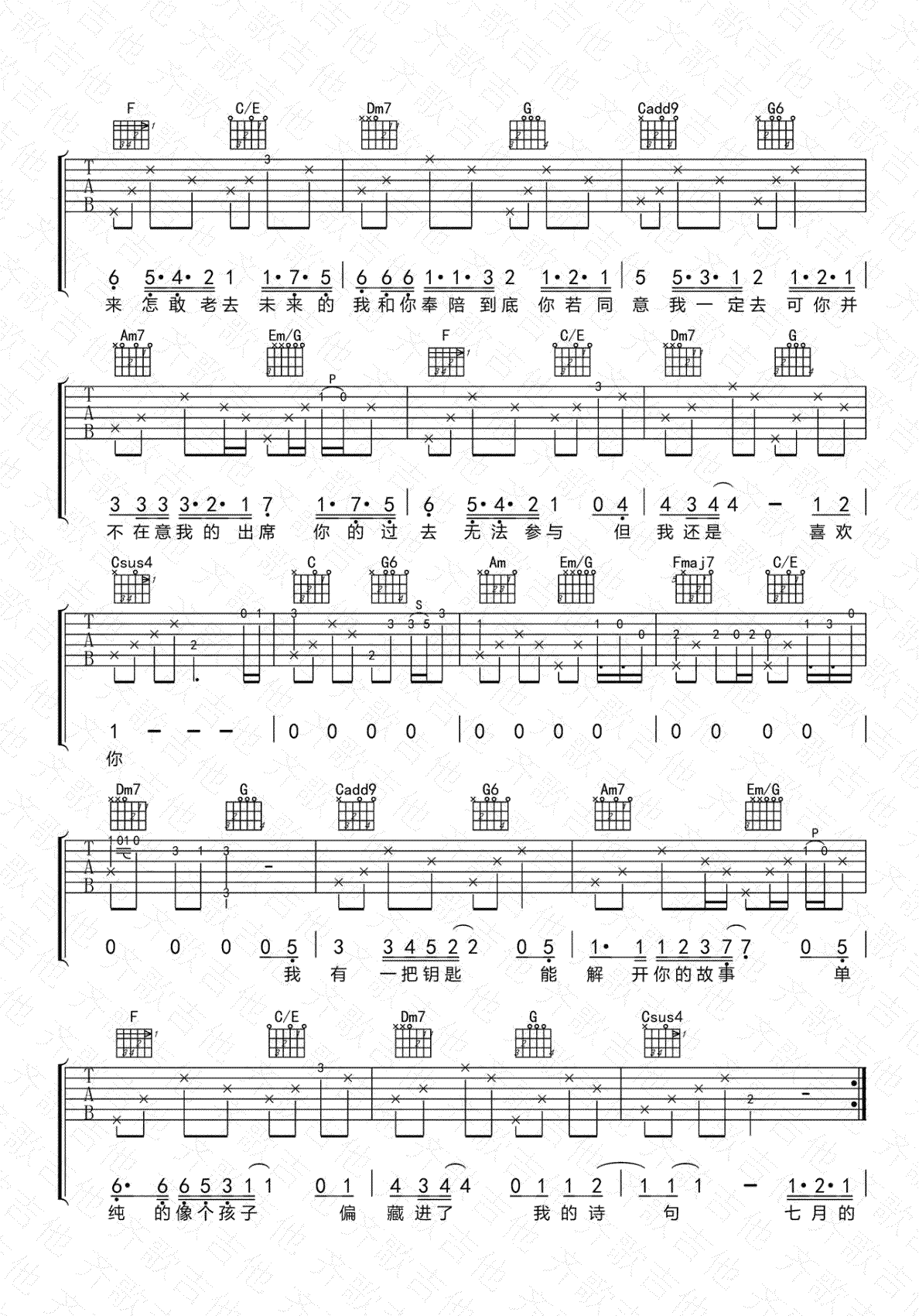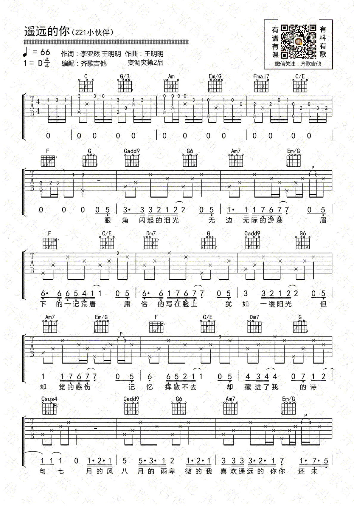 鸭脖娱乐app-手机APP下载-易唱网echangwang.com 时间:2018-12-31 来源:齐歌吉他 点击:次 遥远的你吉他谱,221小伙伴演唱,C调指法,变调夹夹第二品。遥远的你六线谱,高清弹唱图片谱,齐歌吉他编配,易唱网上传更新。 很简单的一首民谣吉他弹唱,因为原曲是两把吉他伴奏,这里改编成一把吉他演奏,其中几个段落有重复的部分,编配时没把每个音都做细致的记录,不过这并不意味着不原版,对这吉他伴奏为唱歌服务的简单分解和弦而言,弹奏有一定的随机性,同学们也可参照谱子自由处理。