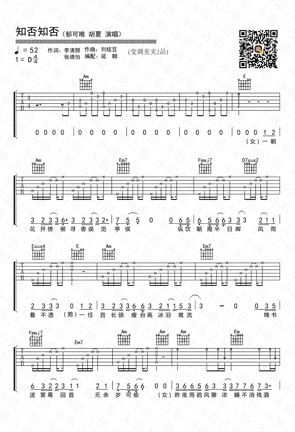 知否知否吉他谱 胡夏&郁可唯 电视剧主题曲 弹唱谱 时间:2019-01-02 来源:齐歌吉他 点击:次 知否知否吉他谱,胡夏郁可唯演唱,电视剧《知否知否应是绿肥红瘦》的主题曲,知否知否六线谱,原调D,变调夹夹二品,弹唱图片谱,齐歌吉他延麟编配,易唱网更新分享。 这首歌曲是由南宋女词人李清照著名的《如梦令》改编而来。旋律比较简单,在这里配的和弦也比较常见,伴奏型使用的也很简单,做为弹唱版是完全够用了。