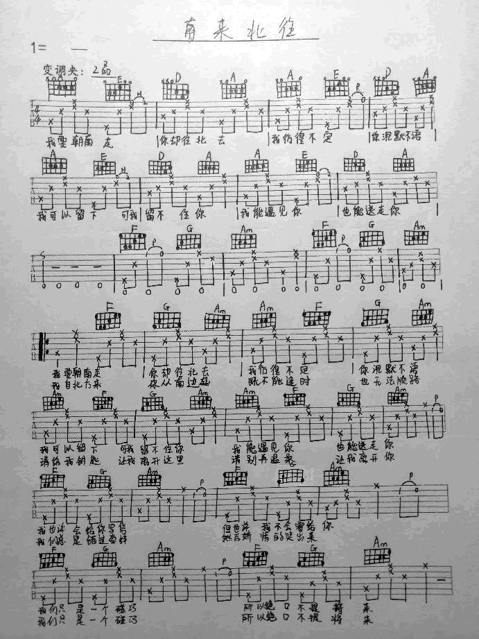 南来北往吉他谱 花粥 弹唱六线谱 手写版 时间:2019-01-05 来源:ACHen 点击:次 花粥《南来北往》吉他谱,变调夹夹二品,南来北往六线谱手写版,ACHen供谱,易唱网上传。 一句“我要往南走,你却往北去”唱出生活中无数场背对背的南来北往,我能遇见你,也能送走你。现实生活中两个人能整天腻在一起,固然很幸福,但他们很少会寂寞,很少有绵长的思念。而思念本身是一种最大的幸福。