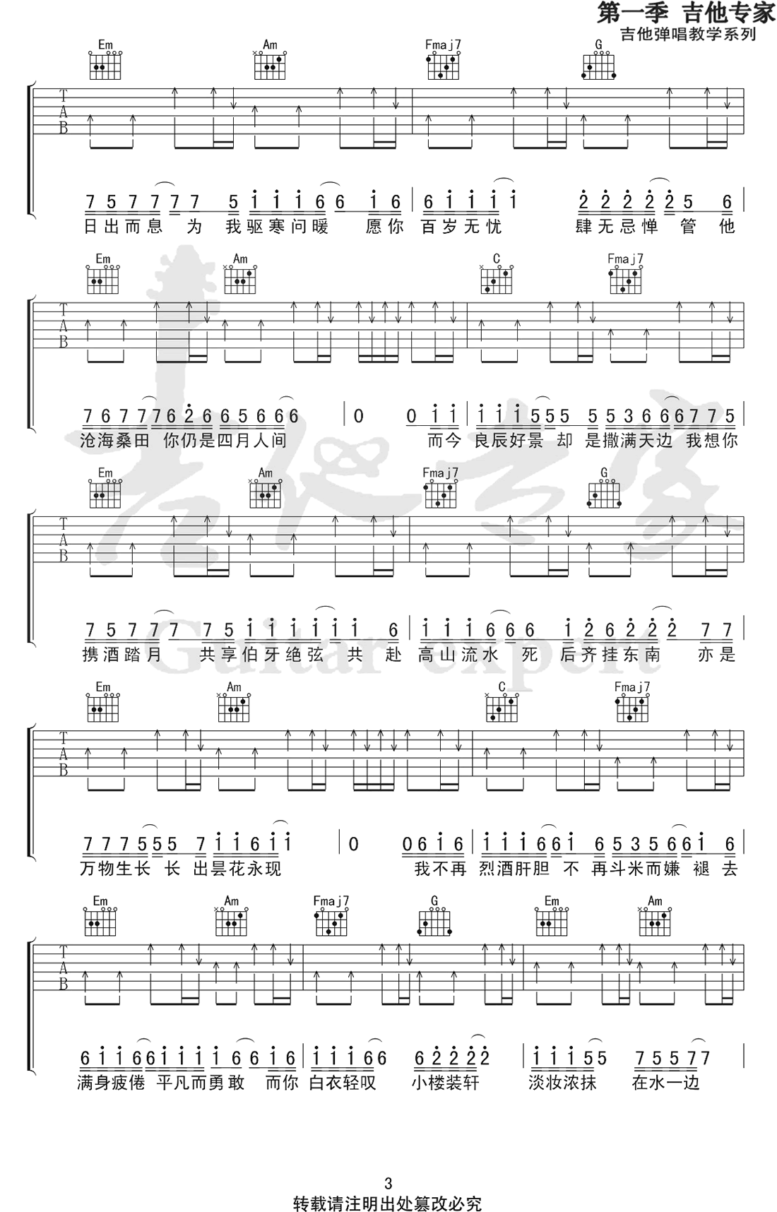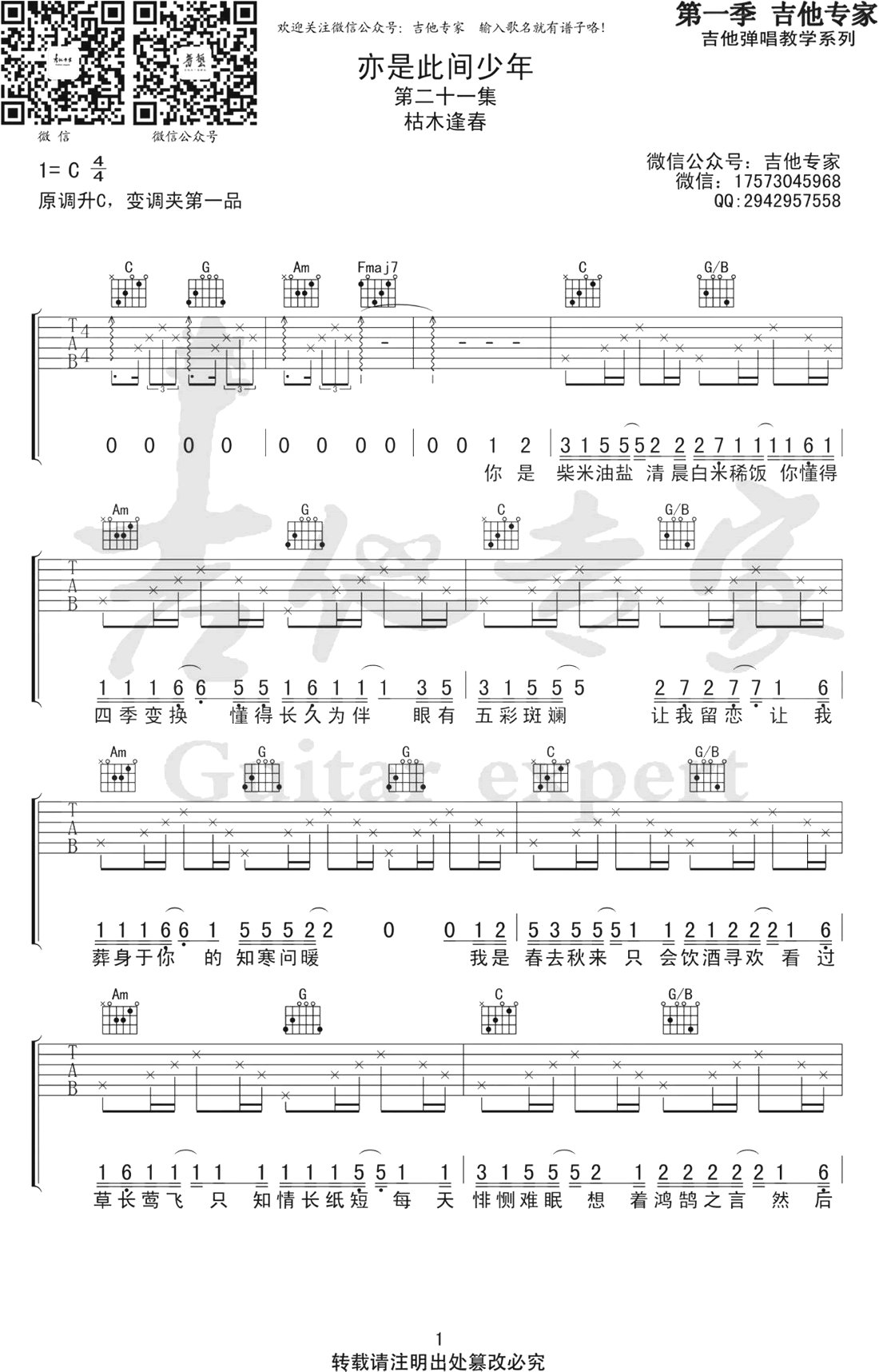 亦是此间少年吉他谱 C调 枯木逢春 弹唱六线谱 时间:2019-03-01 来源:吉他专家 点击:次 亦是此间少年吉他谱,枯木逢春的一首民谣歌曲,原调升C调,采用C调指法,CAPO夹一品。亦是此间少年六线谱,高清弹唱谱四张图片,感谢吉他专家编配制谱,易唱网为吉他爱好者分享。 很简单的调子但莫名的吸引人,愿你百岁无忧,肆无忌惮,管他沧海桑田,你仍是四月人间。第一次见你,是夏末微凉,书上的山楂忘了落下,南飞的大雁忘了归家,蓦然回首,你亦是此间少年。