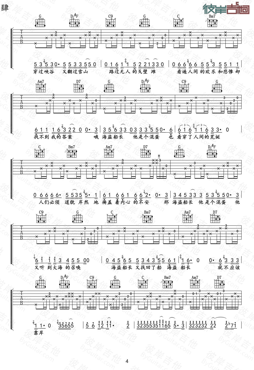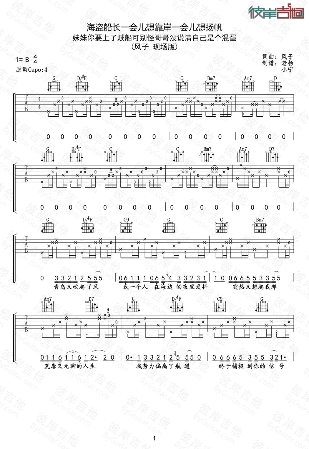 海盗船长吉他谱 风子 G调六线谱 歌名超长的民谣歌曲 时间:2019-03-02 来源:小宁吉他 点击:次 海盗船长吉他谱,风子演唱的一首歌名超长的民谣歌曲,《海盗船长一会想靠岸一会想扬帆妹妹你要上了贼船可别怪哥哥没说清自己是个混蛋》六线谱,原调B,Capo夹四品,易唱网上传分享。 小宁老师曲谱说明:本谱是根据网易云音乐风子的现场版,原版编配,1-5-4-1-4-3-2-5的和弦级数变换,采用G调和弦,变调夹夹4品,男女同调(海盗船长2.0)遵循原版全记录,共五张谱子(无反复)杨老师做的简谱,我整理的六线谱。