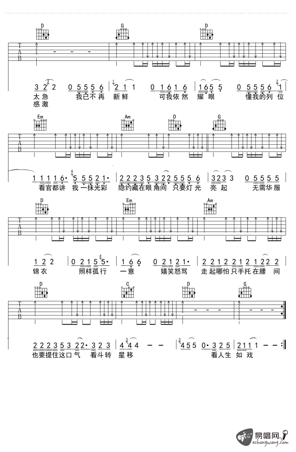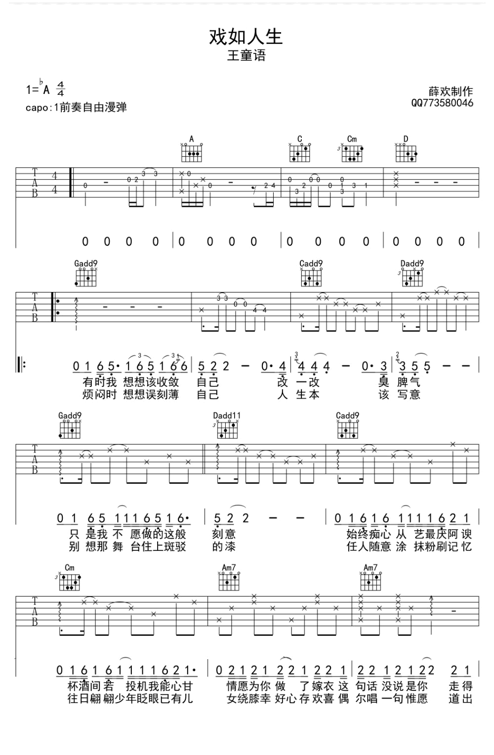 戏如人生吉他谱_王童语_抖音红人_吉他弹唱谱 时间:2019-03-25 来源:薛欢 点击:次 《戏如人生》吉他谱,抖音红人王童语演唱,降A调,CAPO夹一品。戏如人生六线谱,高清弹唱图片谱,感谢薛欢制作,易唱网上传更新。 人生如戏,每个人都粉墨登场,在各自的生活中扮演不同的角色 ,起起落落经历不同的人生,悲欢离合感受喜怒哀乐。愿琴友们在人生的舞台上,做好自己的主角,去演绎精彩的人生。