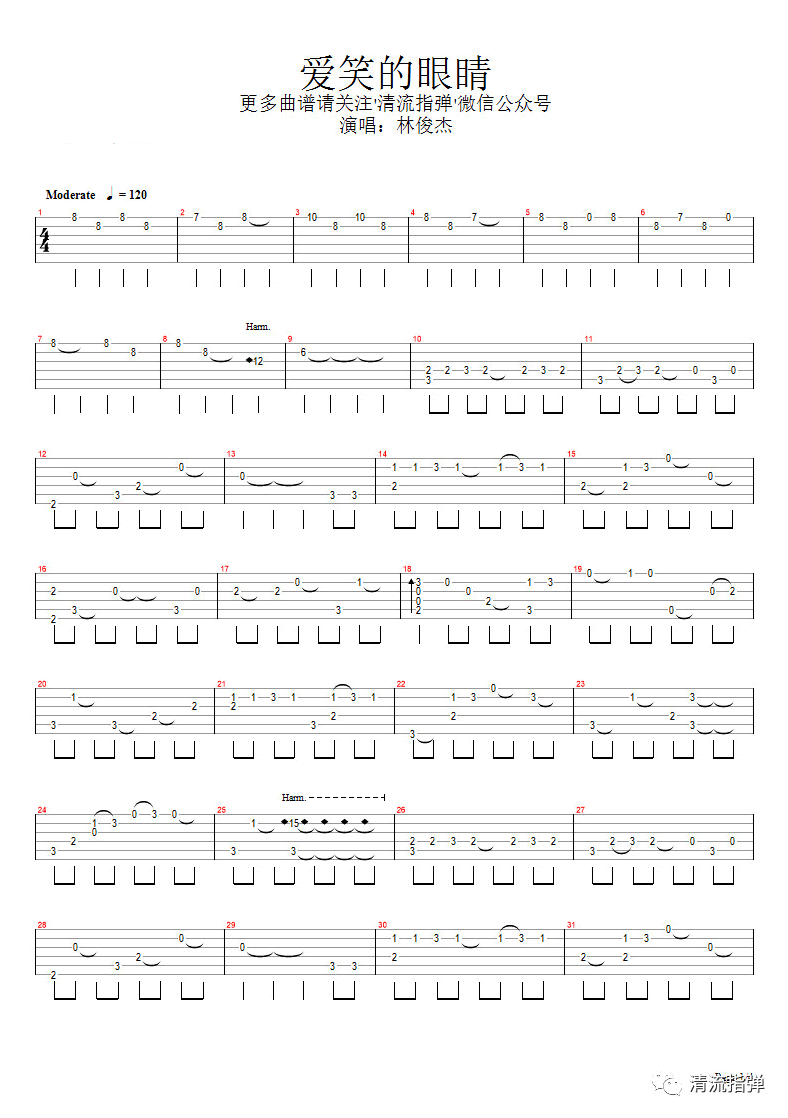 爱笑的眼睛指弹谱_林俊杰_吉他独奏谱_完整版 时间:2019-03-31 来源:清流指弹 点击:次 爱笑的眼睛指弹谱,林俊杰的一首老歌改编,爱笑的眼睛吉他独奏谱,四张图片谱,清流指弹编配,易唱网上传更新。 徐若瑄05年发行,而JJ10年重新演绎了这首歌曲,两个版本各有特点 。此曲是鼓励失恋者坚强振作,重新去找回生活中的快乐。其实,曾经真心付出的情感,是无法轻易忘怀的,就像你那双爱笑的眼睛,永远在脑海里,仿佛我们纯粹美好的爱情。