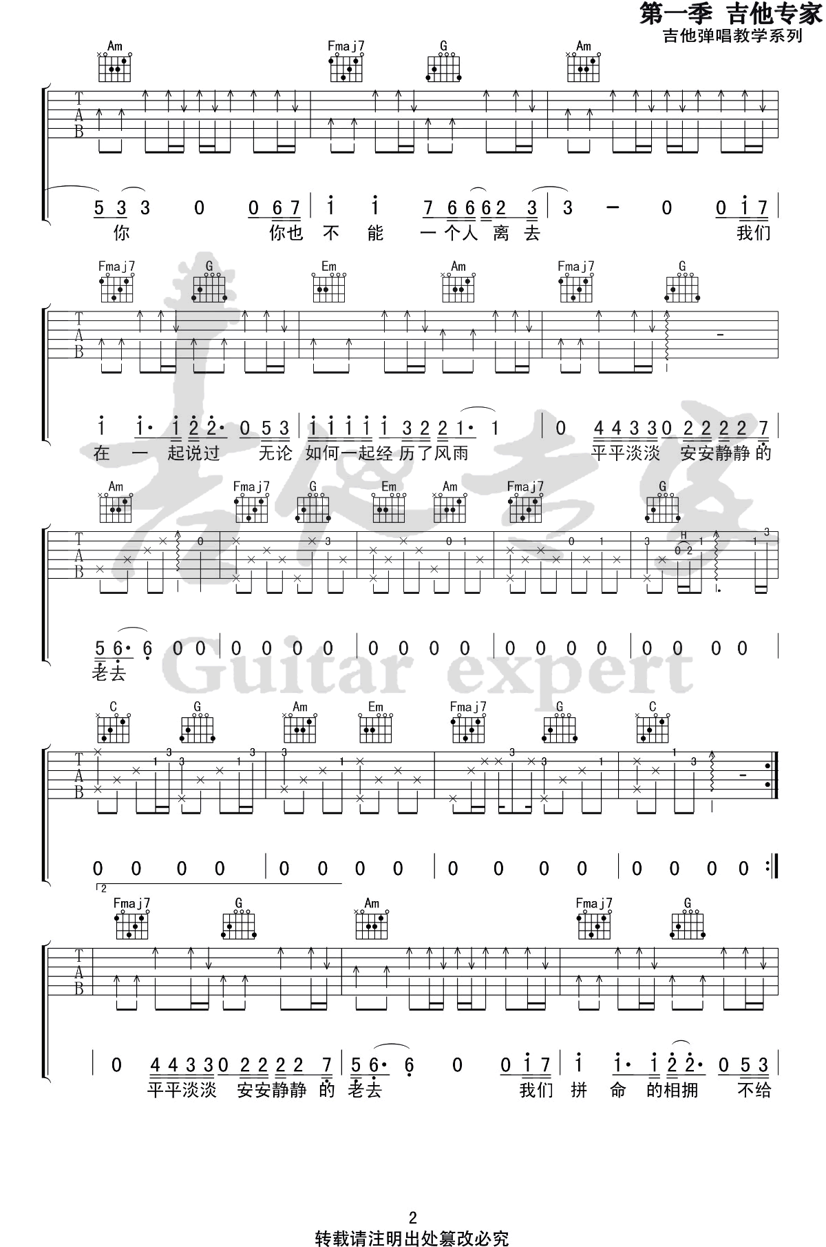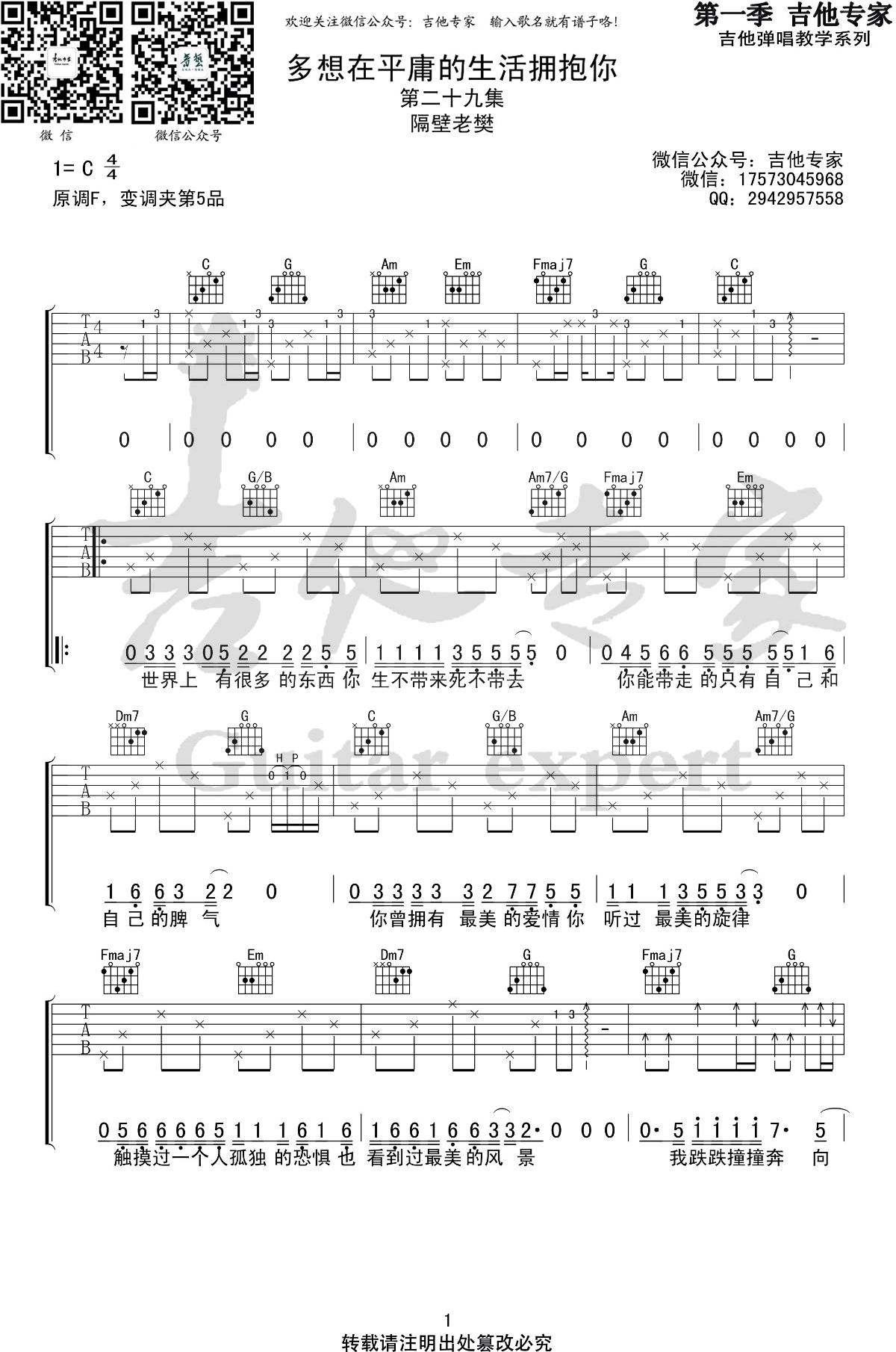 多想在平庸的生活拥抱你吉他谱_隔壁老樊_C调六线谱 时间:2019-04-10 来源:吉他专家 点击:次 多想在平庸的生活拥抱你吉他谱,隔壁老樊演唱的一首网络热门歌曲,原调F,选用C调指法,变调夹夹第五品。多想在平庸的生活拥抱你吉他六线谱,高清弹唱图片谱三张谱例,感谢吉他专家编配分享,易唱网为琴友们整理推荐。 若生活梦想成真,我要抱你无数次。可是,我们拼命的相拥不给孤独留余地,而无力,却是我们最后难免的结局。那些不再转身的背影,让我们懂得了什么才应该珍惜。