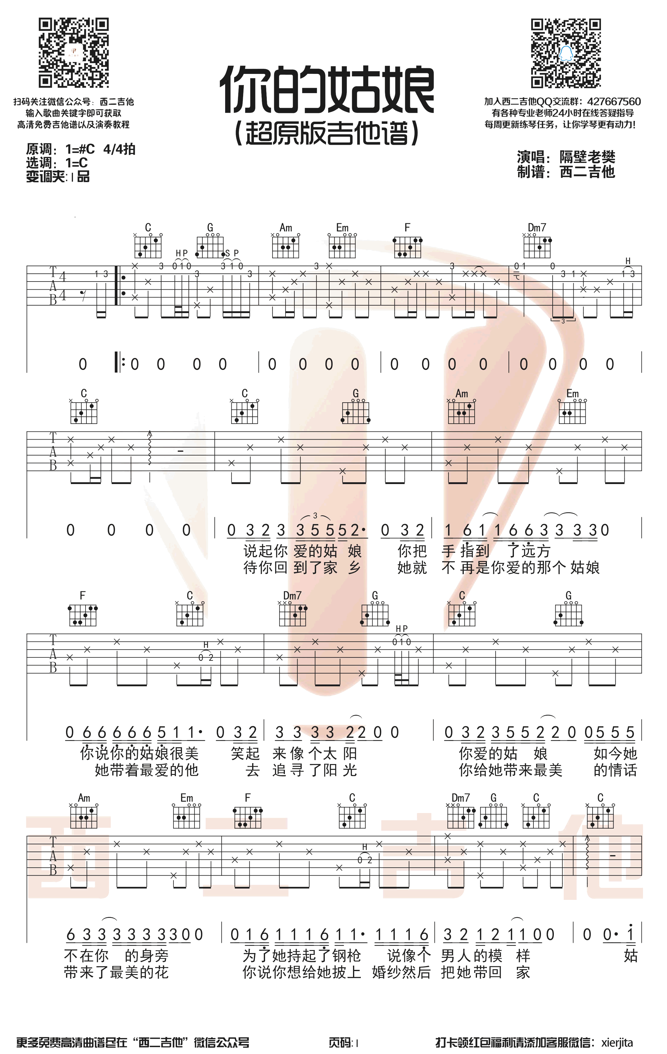 NBA正规买球-手机APP下载-易唱网echangwang.com 时间:2019-04-15 来源:西二吉他 点击:次 你的姑娘吉他谱,隔壁老樊演唱的新歌,一首充满爱意的民谣作品,原调#C,选用C调指法,变调夹夹一品。你的姑娘吉他弹唱谱,高清图片六线谱,西二吉他编配,易唱网吉他谱分享上传。 细腻婉转的旋律交织往复、将深埋内心的情感层层推进,唱出心里浓稠的爱意。人生苦短,希望大家听完这首歌,也会遇到那个所爱之人,努力奔向自己的爱情。