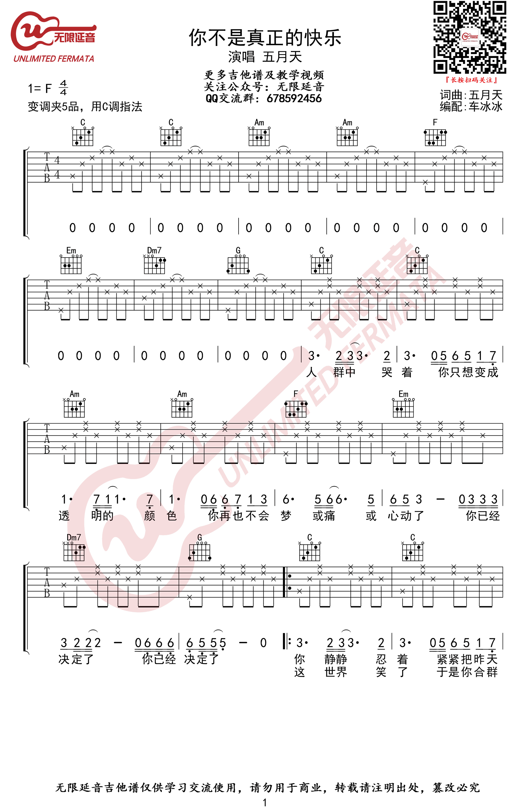 bb贝博app下载官网下载-手机APP下载-易唱网echangwang.com 时间:2019-05-09 来源:无限延音 点击:次 《你不是真正的快乐》吉他谱,五月天演唱,歌曲原调F,选用C调指法,变调夹夹五品。你不是真正的快乐六线谱,无限延音编配,易唱网上传分享。 五月天的词,总那么直白,那么直抵人心。一句“你不是真正的快乐 你的笑只是你穿的保护色”,轻易间触碰心底柔软处。一首疗伤歌曲,唱出多少人内心的孤独。