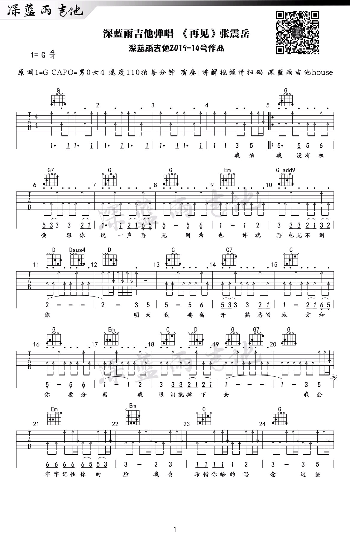 再见吉他谱_张震岳_G调_吉他演示+教学视频 时间:2019-05-13 来源:深蓝雨吉他 点击:次 张震岳《再见》吉他谱,G调指法,如果女生推荐变调夹夹四品。再见六线谱,演奏+讲解教学视频。大家在演奏的时候可以把曲谱中的G7换成Em试试,看效果会不会好点,觉得好,就可以直接换过来!深蓝雨编配分享,易唱网整理分享。 一段青春的回忆,来自于你我的青葱初恋的时光。挥手道声再见,也许,就可能就永远不见了吧,不过,我会永远记住你的笑脸,珍存每一刻的思念。非常适合表达毕业季情感的一首,相信经历过或者正在经历分别的朋友一定深有感触。