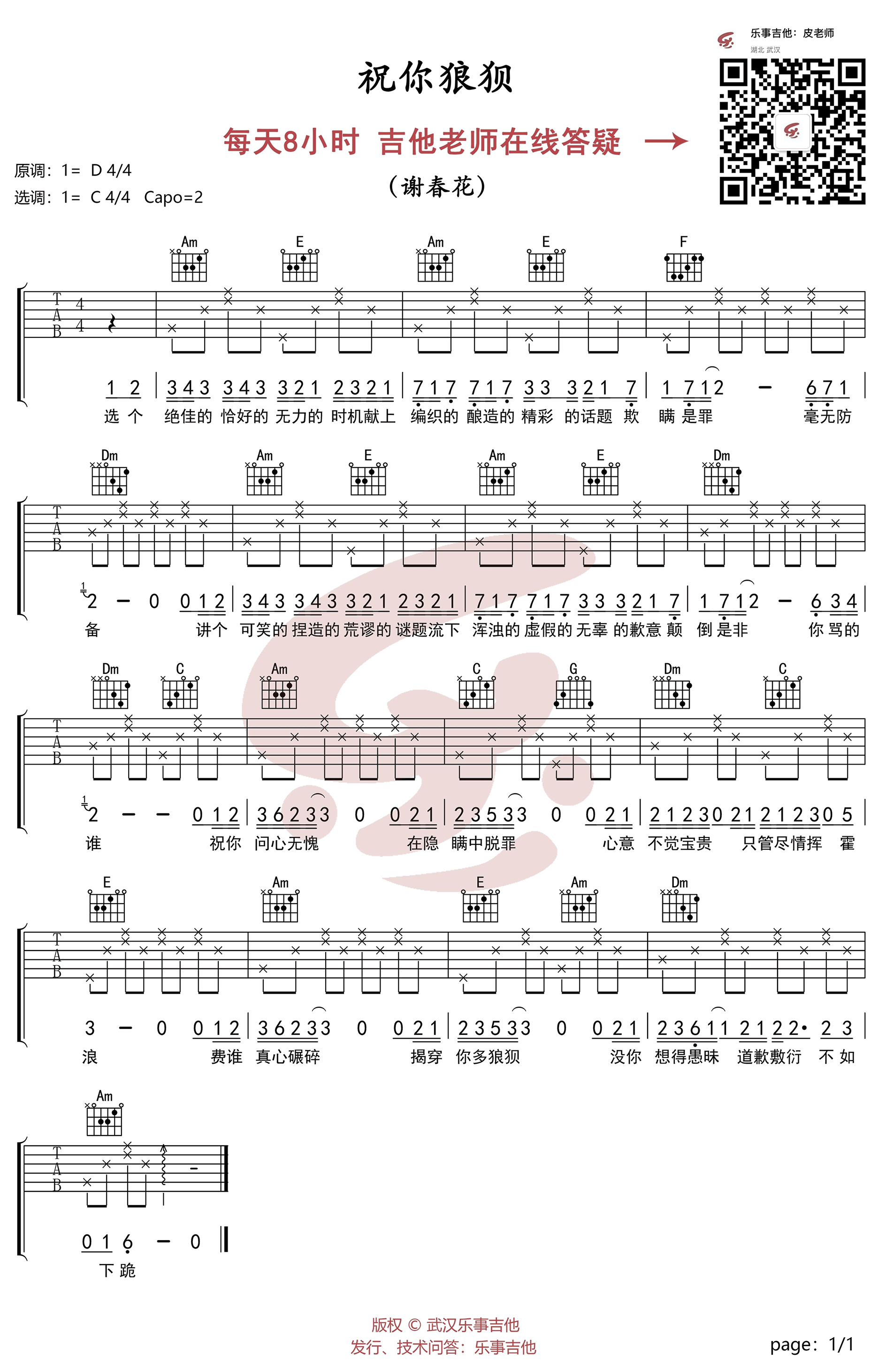 祝你狼狈吉他谱_谢春花_C调简单版_弹唱教学视频 时间:2019-05-17 来源:乐事吉他 点击:次 谢春花《祝你狼狈》吉他谱,原调D,选用C调,Capo夹二品。祝你狼狈六线谱,简单版编配,乐事吉他制谱分享,易唱网整理上传。随谱附上《祝你狼狈》吉他弹唱教学视频,琴友们跟随老师讲解示范练习。你被人背叛与伤害过吗?信任是否一钱不值呢? 希望你永远不会被人将真心碾碎,我们谁也不傻,我们只是不想与欺骗我们的那个人为伍,也去欺骗和伤害别人。 那么,那个欺骗我们的谁,就祝你狼狈吧。