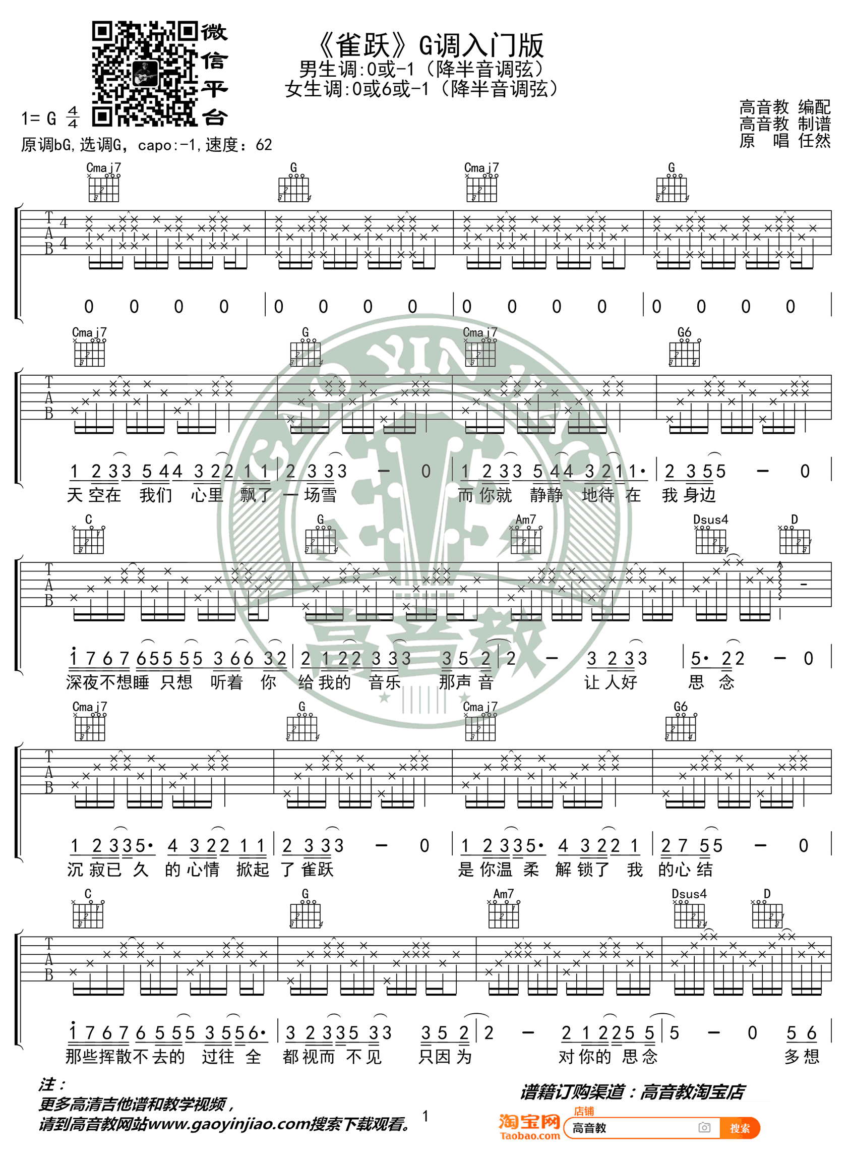 BET9—10年信誉亚洲第一品牌-手机APP下载-易唱网echangwang.com 时间:2019-05-27 来源:高音教 点击:次 《雀跃》吉他谱,任然和小来哥演唱的一首对唱情歌,多想留在你的身边,让爱渗透了整个世界。电影《再见17岁》主题曲,雀跃六线谱,G调入门版编配,降半音调弦,高音教编配出品,易唱网更新分享。 文艺清新的歌词,恬静优美的旋律,慢板暖情歌《雀跃》,唱出爱情来临的欢喜。歌曲抓住生活中微小但美好的一些时刻,将之演绎出来,让人有如沐春风般的亲切舒服。